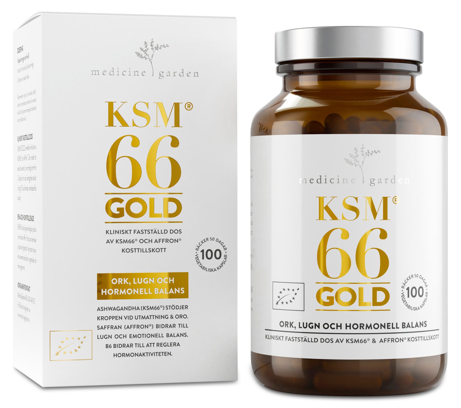 KSM66 Gold från Medicine Garden kombinerar KSM66® och Affron® tillsammans med vitamin B6 i sin aktiva form P-5-P. Både KSM66® och Affron® har kliniska studier bakom sig med positiva resultat på stressrelaterade problem. Affron (saffran) förstärker effekten hos KSM66, och vitamin B6 i sin lättupptagliga form P-5-P (Pyridoxal-5-Fosfat), bidrar till reglering av hormonaktiviteten och till ett normalt nervsystem. KSM66® framställs med hjälp av "Green Chemistry", en ren och miljövänlig process som är helt fri från kemiska lösningsmedel och alkohol. Denna ekologiska metod gör KSM66® mer biotillgänglig, vilket innebär att kroppen lättare kan ta upp och använda det.