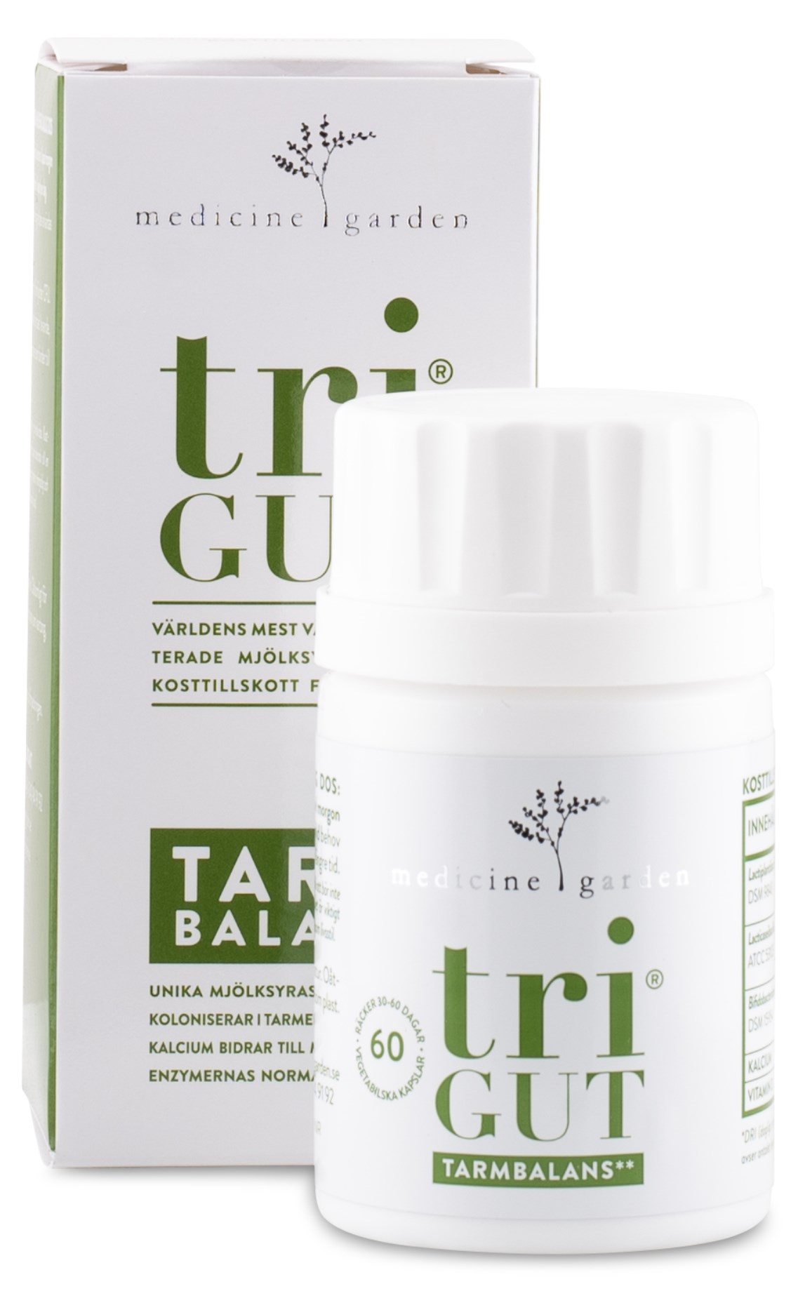 Ta hand om din mage med MedicineGarden triGUT, världens mest väldokumenterade mjölksyrakomplex! De tre individuella bakteriestammarna som utgör basen i TriGUT har studerats i drygt 30 år och dokumenterats i över 1200 studier. De visar att stammarna överlever till tarmen där de binder sig till slemhinnans olika delar, vilket är grunden till tillskottets funktion och effekt. Nu finns dessutom - för första gången! - alla tre bakteriestammar i en och samma kapsel. De förstärker varandras effekt och koloniserar tarmen, vilket innebär att de till och med fortplantar samt förökar sig. MedicineGarden triGUT - ett unikt tillskott för din mag- och tarmhälsa!