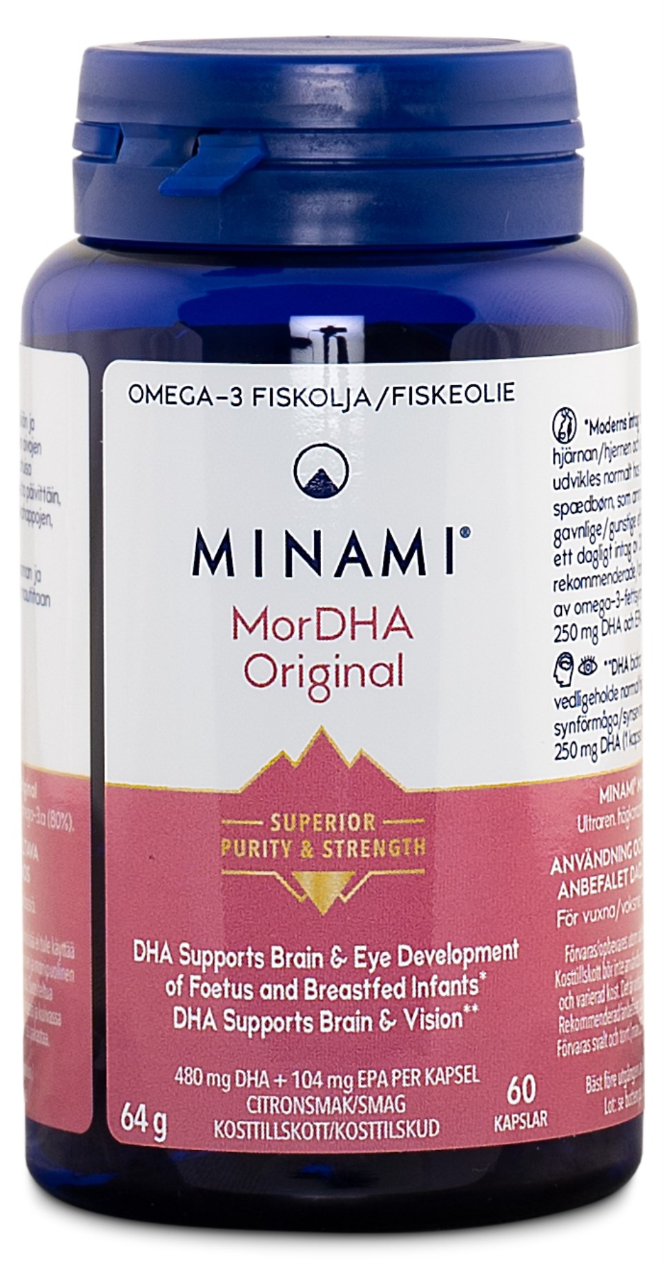 Minami MorDHA innehåller naturlig omega-3 och minst 75 % renade, koncentrerade omega-3 fettsyror. Omega-3 fettsyran DHA är viktig under graviditet och amning eftersom det ingår i modersmjölken. Modersmjölk innehåller omega-3, dock kan mängden variera kraftigt. Mjölkersättning innehåller däremot ingen naturlig omega-3.