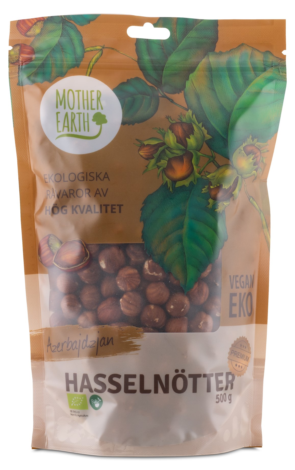Mother Earth Hasselnötter Premium EKO är extra fina ekologiska hasselnötter, hela nötter utan tillsatser. Nötterna kommer från ekologiska odlingar i Azerbajdzjan. Hasselnöten är en av våra mest välkända och uppskattade nötter som flitigt används både som snacks, i müsli, bröd och bakverk. Hasselnöten har en naturlig sötma och är rik på protein, hälsosamma fetter och vitamin E. Använd som smakförhöjare med tuggmotstånd, eller som extra protein- och näringskälla.
