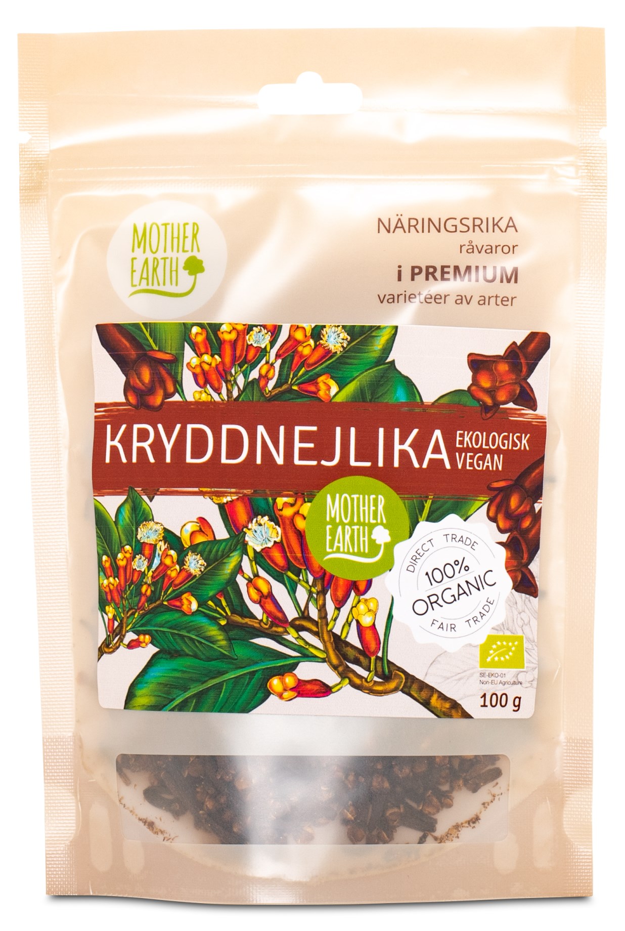 Mother Earth Kryddnejlika Eko består av ekologisk kryddnejlika från Sri Lanka. Dess karaktäristiska doft och arom för ofta tankarna till julen, men kryddan går att använda året om. Kryddnejlikan har många användningsområden och passar bland annat i soppor, kötträtter samt ris som smaksättare. Du kan även använda den i olika bröd eller bakverk. Kring jul är det vanligt att använda kryddnejlika i pepparkakor och glögg, samt för att smycka apelsiner.