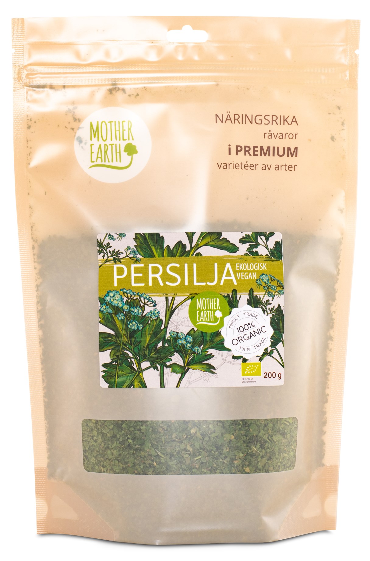 Mother Earth Persilja Eko består av hackad och torkad persilja. Med sina söta och kryddiga smak passar persilja bra i många olika rätter, till exempel i grytor, pastarätter, sallader och röror. Örten går även väl ihop med potatis eller couscous. Mother Earth Persilja Eko är helt ekologisk.