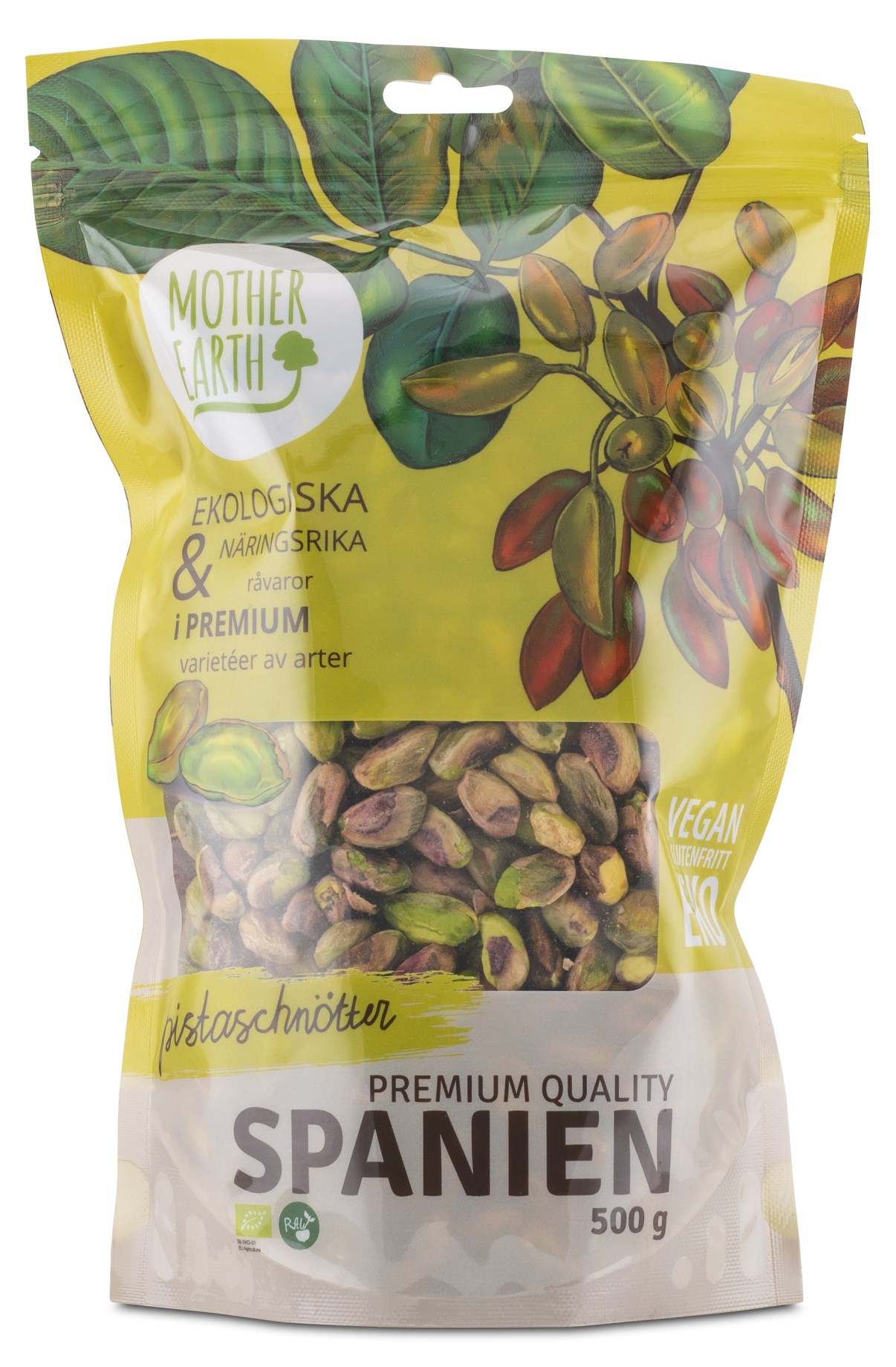 Pistaschnötter Premium Raw & Eko från Mother Earth är skalade pistagenötter (Pistacia vera), som är både rostade och saltade. Trots att de kallas pistagemandel eller pistagenöt i livsmedelssammanhang, är de botaniskt sett inte en nöt. Därför är de ofta ett bra alternativ för dem med nötallergi. Njut av dem som ett smakfullt och hälsosamt snacks direkt ur förpackningen!
