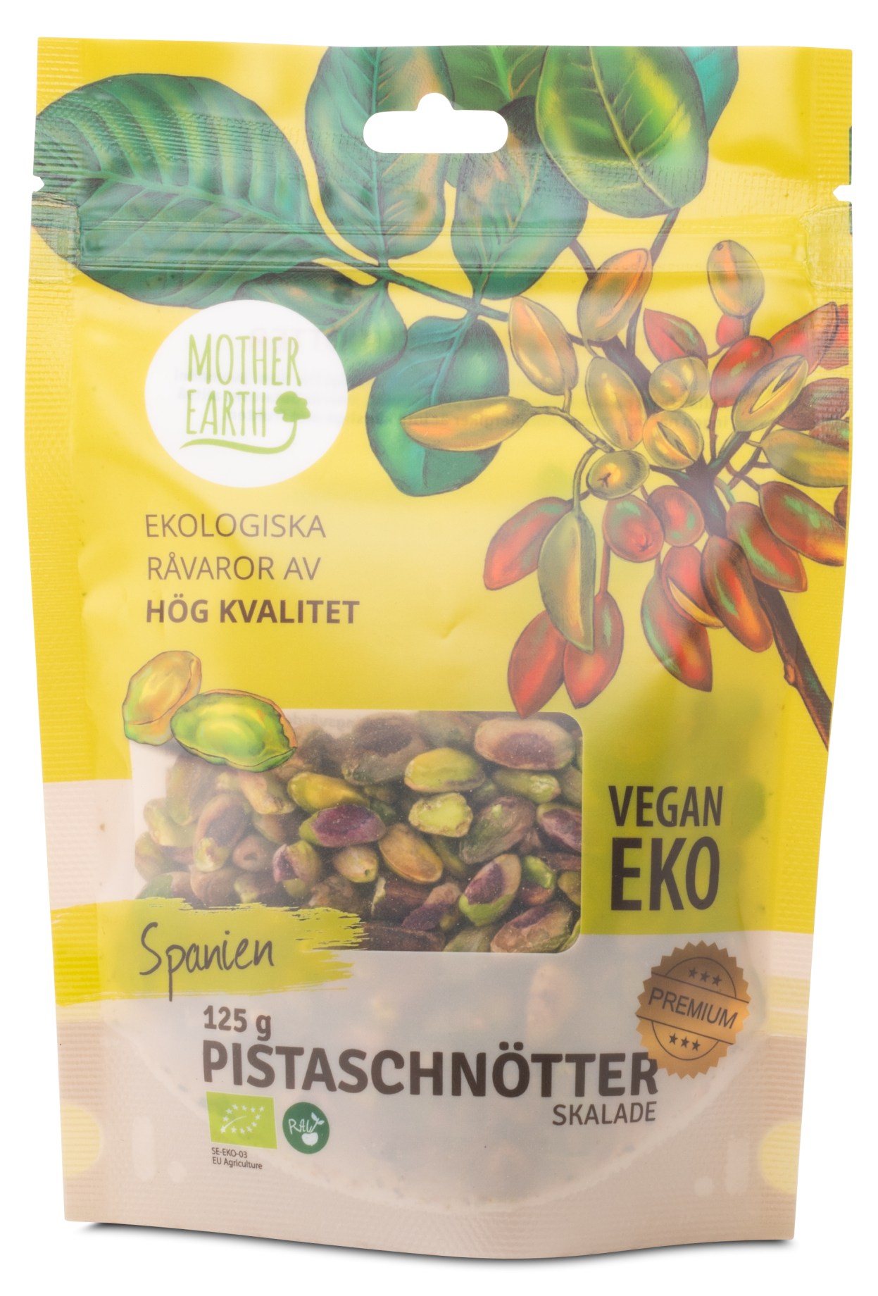 Pistaschnötter Premium Raw & Eko från Mother Earth är skalade pistagenötter (Pistacia vera), som är både rostade och saltade. Trots att de kallas pistagemandel eller pistagenöt i livsmedelssammanhang, är de botaniskt sett inte en nöt. Därför är de ofta ett bra alternativ för dem med nötallergi. Njut av dem som ett smakfullt och hälsosamt snacks direkt ur förpackningen!