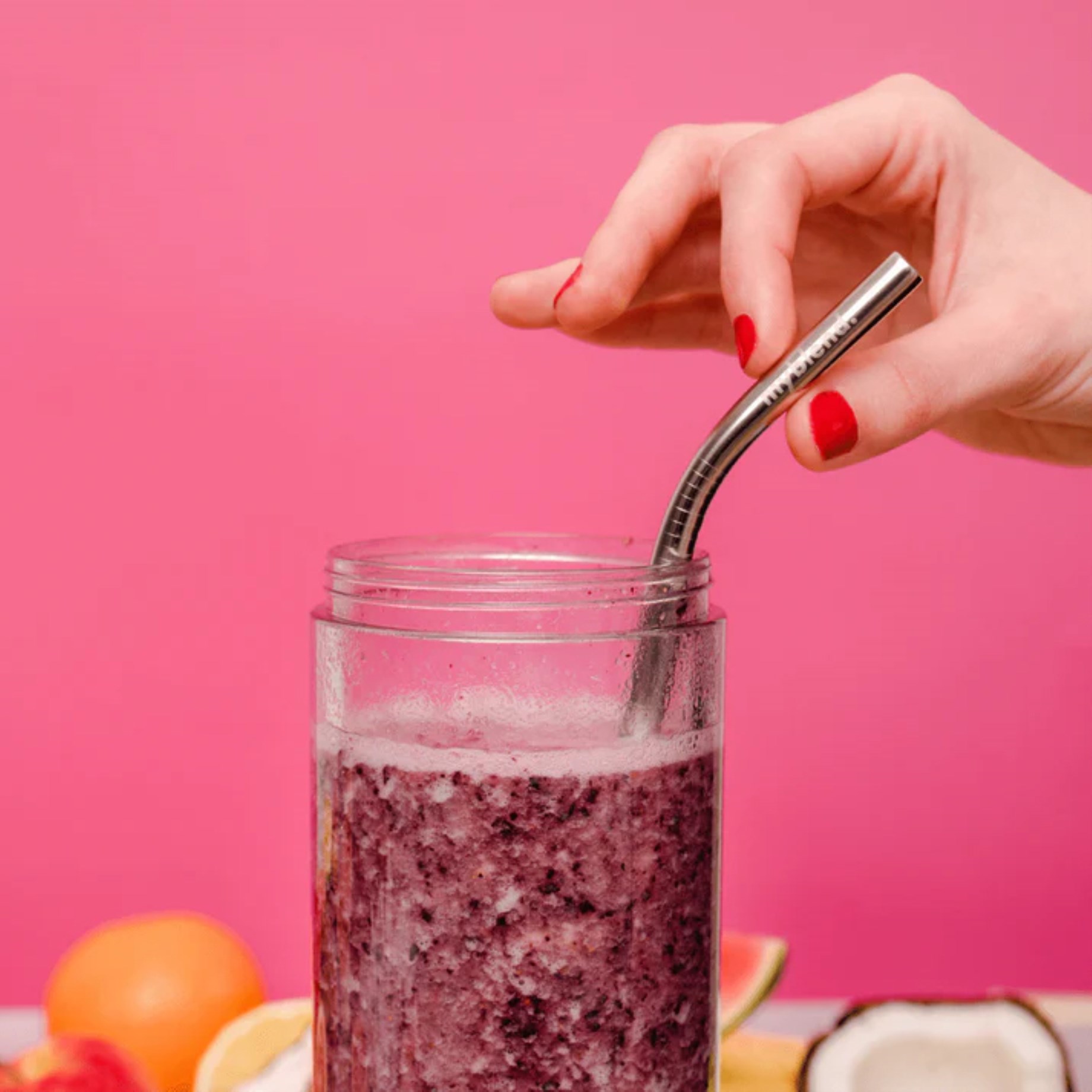 Drick energidryck, smoothie eller vatten med Myblend XL Stålsugrör, ett par återanvändbara sugrör i stål. Miljövänligt och ett utmärkt alternativ till sugrör i plast. Varje paket innehåller 2 raka och 2 böjda sugrör. För att enkelt rengöra sugrören medföljer även en rengöringsborste.