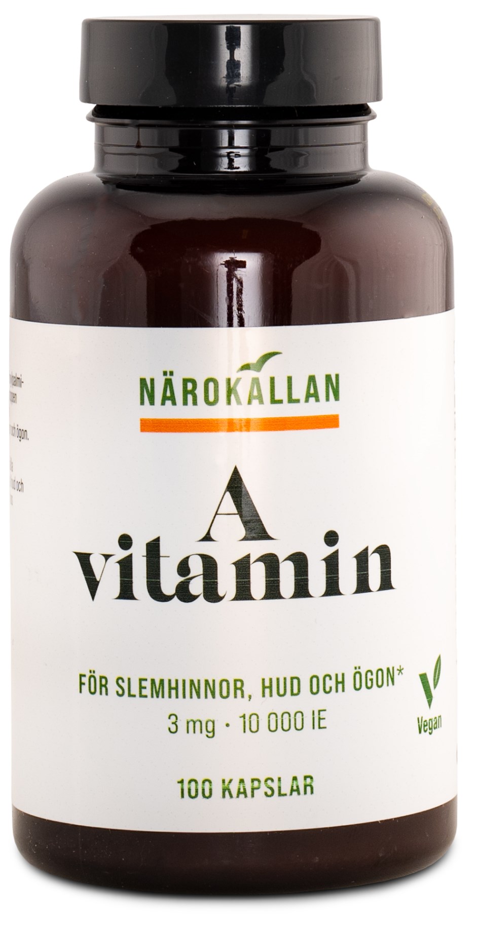 Närokällan A-Vitamin är ett tillskott av vitamin A. Tack vare dess rena och koncentrerade formula av retinylpalmitat kan kroppen ta upp vitaminet direkt. A-vitamin är ett viktigt vitamin för kroppens välmående och bidrar bland annat till ögats normala funktion men även till ett normalt fungerande immunsystem. A-vitaminet är hämtat från kokosfett. Kosttillskottet är helt veganskt och kapslarna är vegetabiliska gjorda av pullulan.