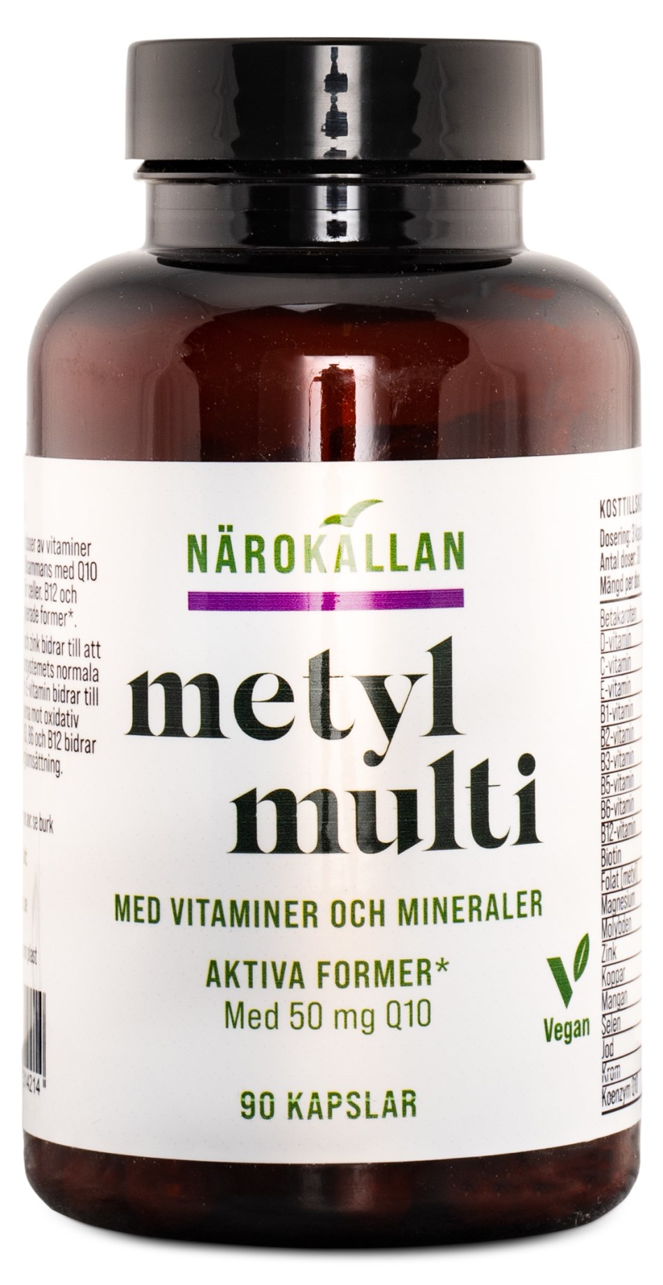 Närokällan Metyl Multi är en multivitamin utan onödiga tillsatser. Den innehåller en dos av alla vitaminer och mineraler tillsammans med Q10 för energi till cellerna. Vitamin B12 och folat är i metylerade former vilket möjliggör ett snabbt och effektivt upptag. Du kan äta Närokällan Metyl Multi om du är vegan och undviker animaliska källor. Närokällans produkter är rena och högkvalitativa. Kapslarna är gjorda på pullulan vilket är skonsamt för matsmältningssystemet och bryts ner snabbare i magen.
