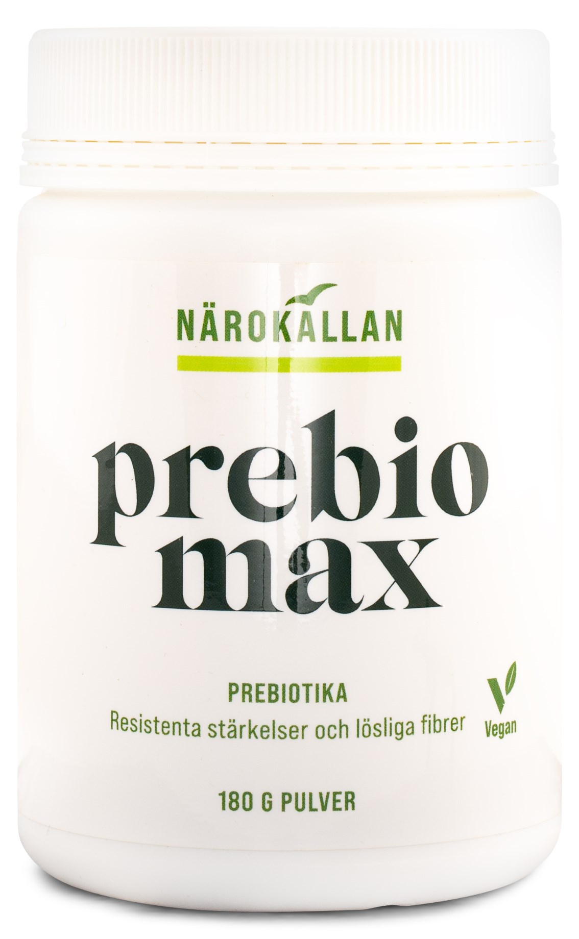 Närokällan PrebioMax är ett kosttillskott med prebiotika. Prebiotika utgörs av fibrer som fungerar som näring till tarmbakterierna, vilket främjar tarmfloran och låter den frodas. Magvänliga tarmbakterier är en del av vårt immunsystem, som skyddar oss från skadliga bakterier. Prebiotika är också hållbart genom matsmältningssystemet och bryts inte ned i mag-tarmkanalen, utan överlever hela vägen till tarmarna där de gör nytta. PrebioMax innehåller fibrer från bland annat agave, akacia, cikoria och grön banan. PrebioMax är ett pulver som du kan blanda med vätska eller strö över maten.