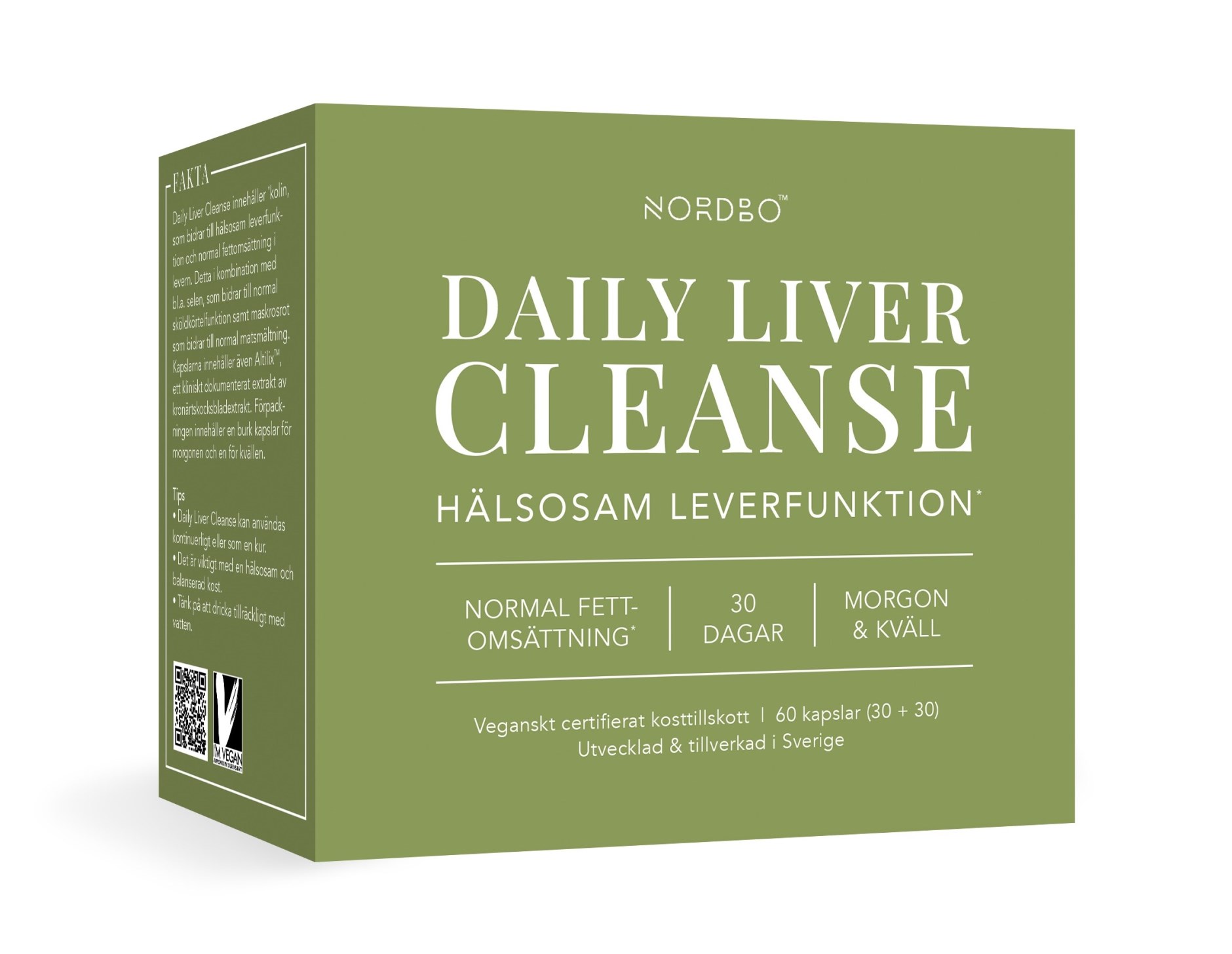 Daily Liver Cleanse från Nordbo innehåller två olika örtkomplex – ett för morgonen och ett för kvällen. Totalt erbjuder paketet 9 aktiva ingredienser som verkar under hela dygnet. Morgonkapslarna innehåller kolin som bidrar till en normal leverfunktion, tillsammans med gurkmeja, kronärtskocka och resveratrol. Nattkapslarna innehåller bockhornsklöver, triphala och maskros. Använd varje dag eller som en 30-dagarskur.