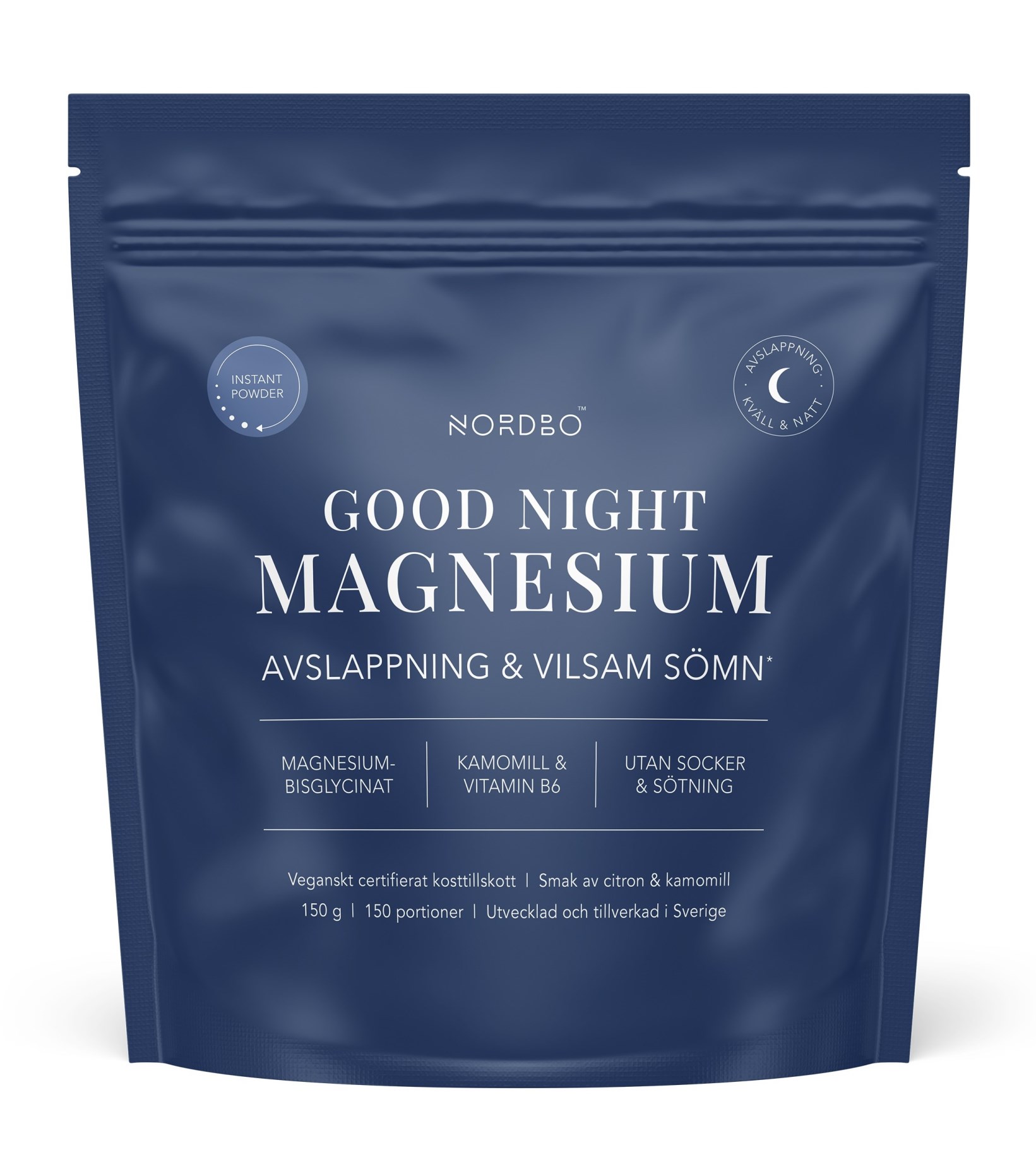 Nordbo Good Night Magnesium Instant Powder är speciellt framtagen för att passa på kvällen före nattsömn. Ett lättblandat pulver med magnesiumbisglycinat tillsammans med kamomillextrakt och vitamin B6, smaksatt med naturlig citronarom. Fritt från övriga tillsatser och sötning. Magnesium bidrar till normal nerv- och muskelfunktion samt till att reducera trötthet och utmattning. Använd som ett dagligt tillskott, bara att blanda i valfri kall vätska.