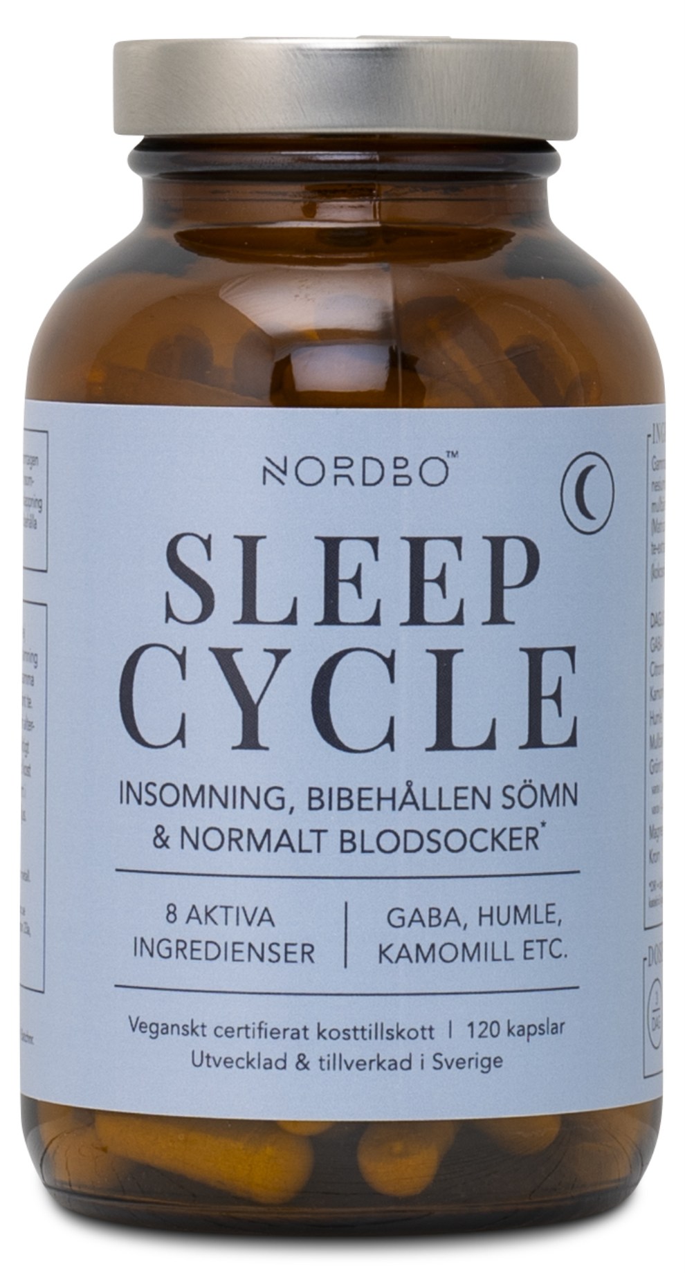 Nordbo Sleep Cycle är ett kosttillskott som är framtaget för att stödja en normal sömncykel och fokuserar på insomning, sammanhängande sömn och normalt blodsocker. Varje kapsel innehåller 8 aktiva ingredienser: GABA, citronmeliss, kamomill, humle, mullbär, magnesium, grönt te och krom. GABA är en av de vanligaste signalsubstanserna i det centrala nervsystemet där den har en dämpande effekt. Grönt te innehåller aminosyran L-teanin, som här utgör 98% av extraktet. Krom bidrar till normala blodsockernivåer, vilket i sin tur kan påverka sömnen positivt. Magnesium bidrar till nervsystemets och musklernas normala funktion, samt till att motverka trötthet och utmattning.