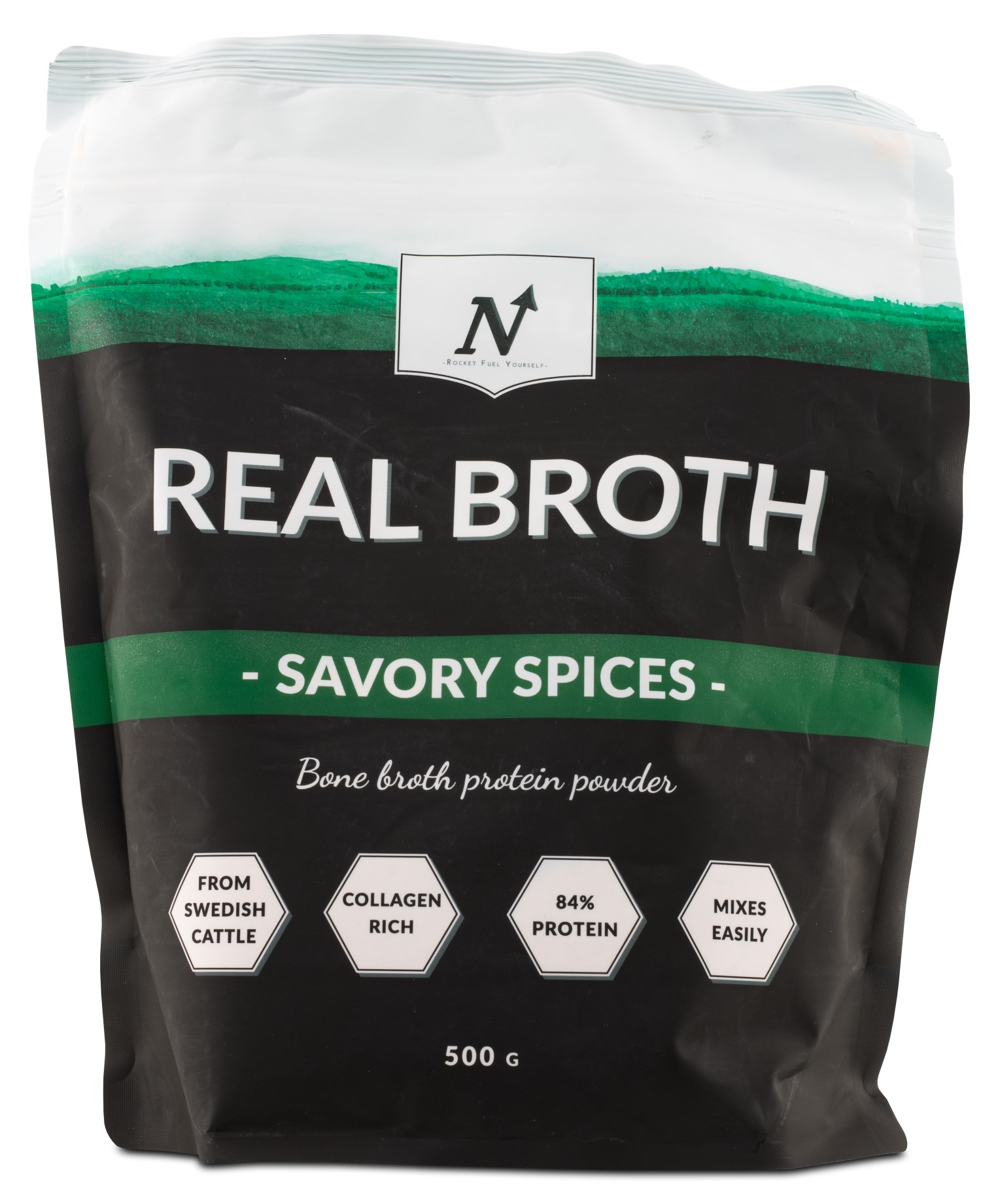 Nyttoteket Real Broth är tillverkad av benbuljong som kokats på märgben från svenska nötkreatur och som sedan har spraytorkats. Genom att koka benbuljong på märgben får du en produkt med hög proteinhalt och hela sju kollagentyper. Alla buljonger blandar sig utmärkt i både varma och kalla drycker, samt passar perfekt i matlagning och bakning. Fria från tillsatt socker och artificiella sötningsmedel.