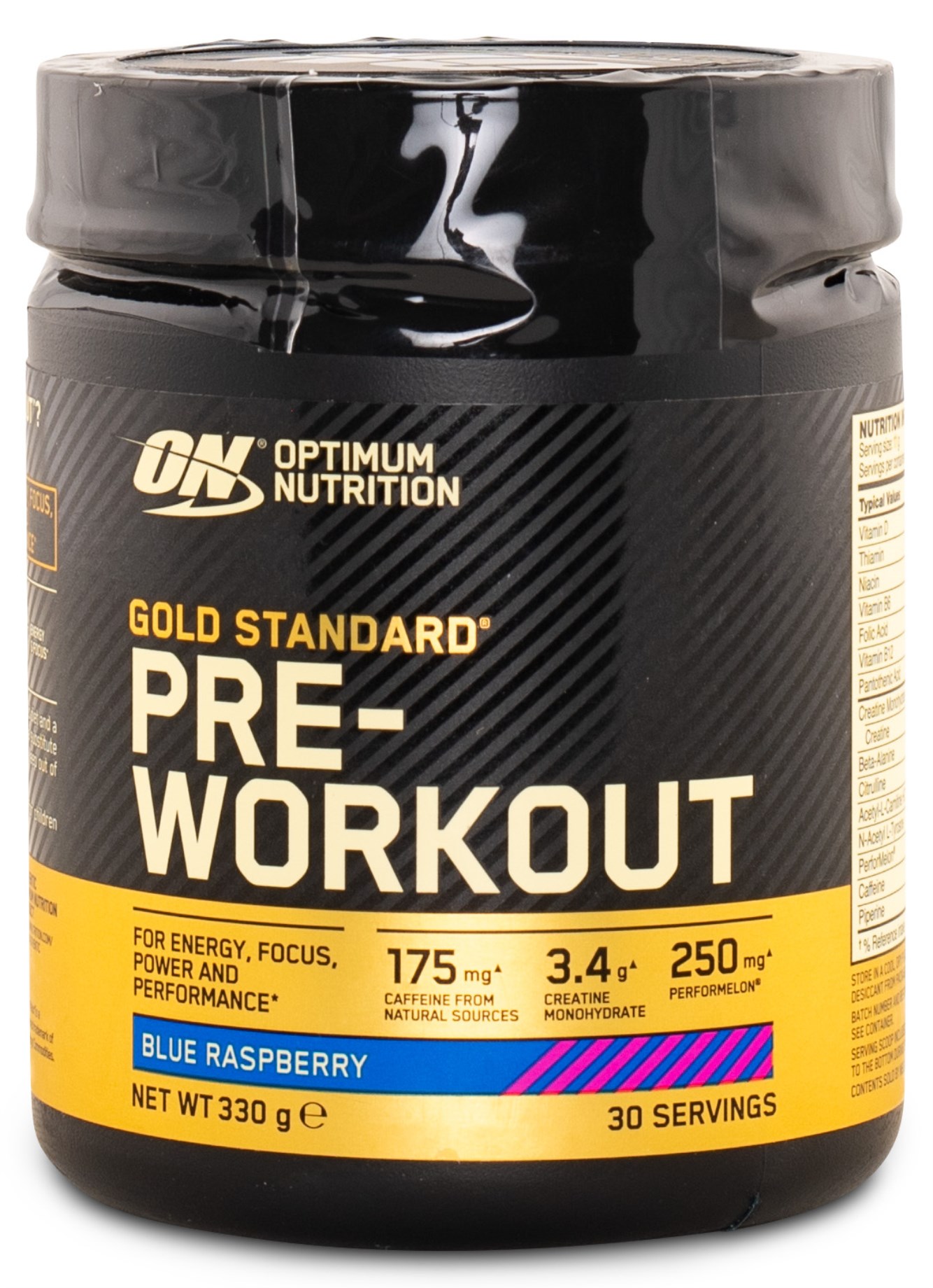 Optimum Nutritions produktlinje Gold Standard samlar de mest avancerade tillskotten med riktigt högkvalitativt innehåll så att du ska få ut det bästa möjliga av din produkt vid hård fysisk ansträngning. Denna PWO innehåller en välbalanserad dos koffein för optimalt fokus med målet att undvika koffeinets oönskade biverkningar. Kreatinmonohydrat bidrar med kreatinets effekter som i samband med kortvarig och högintensiv träning kan öka den fysiska prestationen vid upprepade rörelser. De populära ingredienserna citrullin och beta-alanin gör Optimum Nutrition Gold Standard Pre-Workout till en utmärkt produkt att inta före träning.