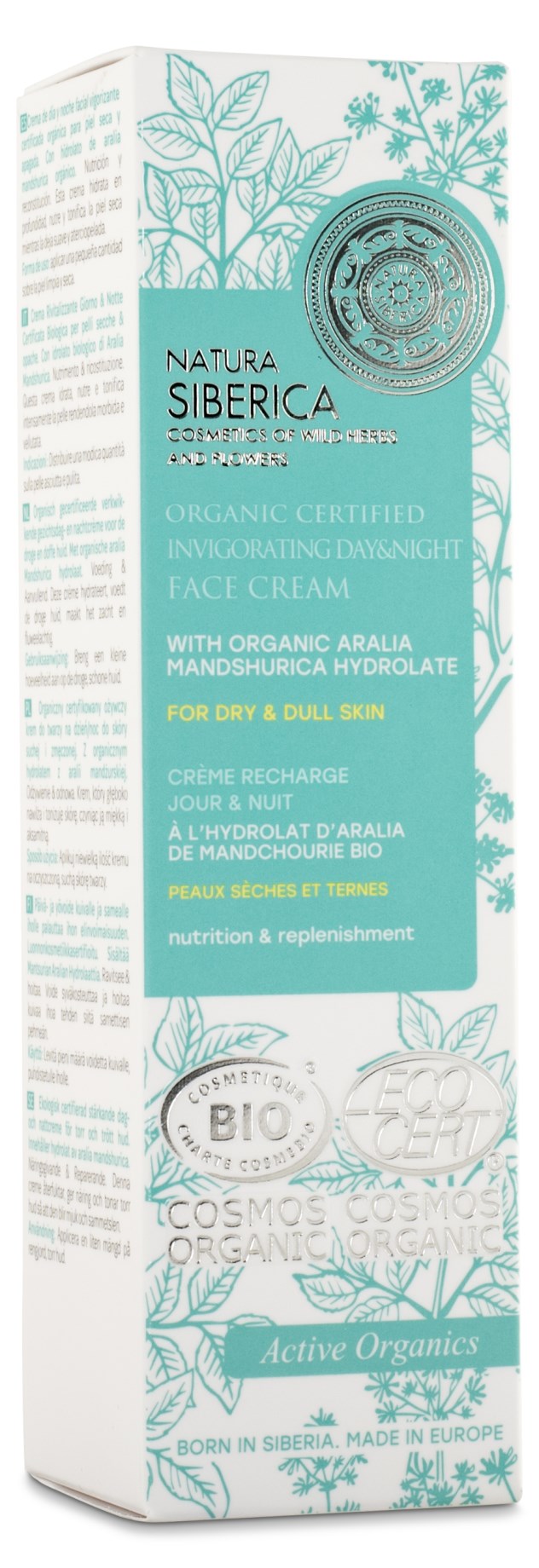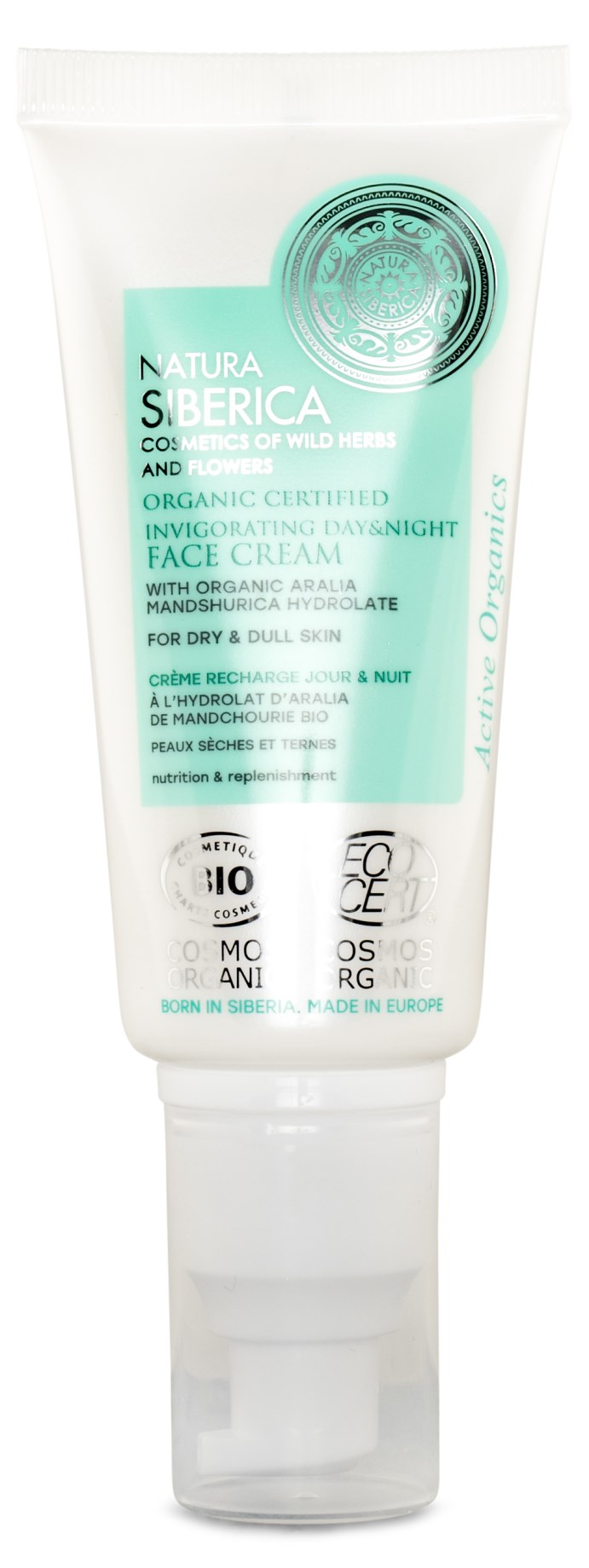 Organic Certified Invigorating Face Day & Night Cream från Natura Siberica är en djupt återfuktande kräm för torr hy utan lyster. Krämen innehåller naturliga och näringsrika ingredienser som gör huden mjuk och silkeslen, och förbättrar även hudens färgton. Krämen har en bas av Aralia mandshurica, en växt som är mycket rik på vitaminer och flavonoider. Den innehåller även sibirisk tallolja, hyaluronsyra och vitamin E. Använd krämen dag och natt för bästa resultat.