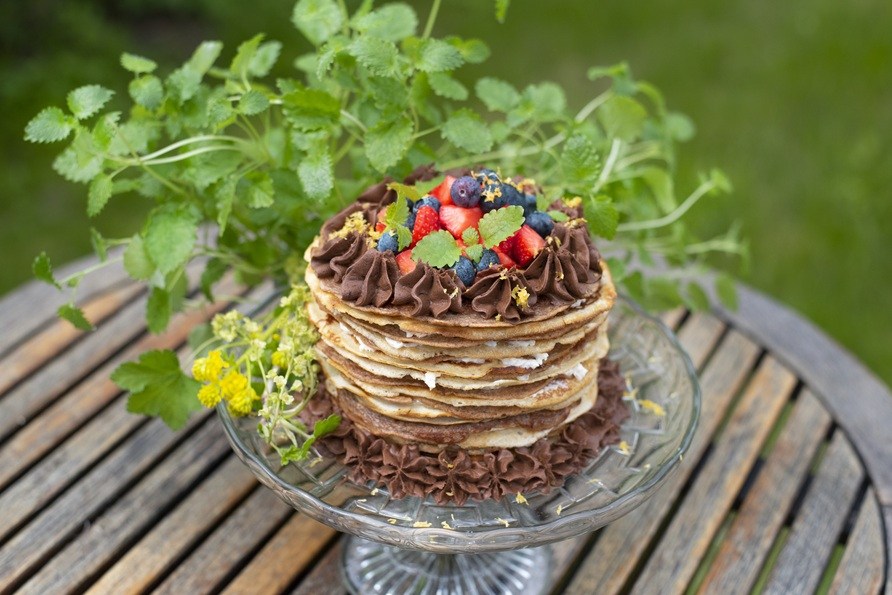 Pannkakstårta med citron, rostad kokos & chokladfrosting