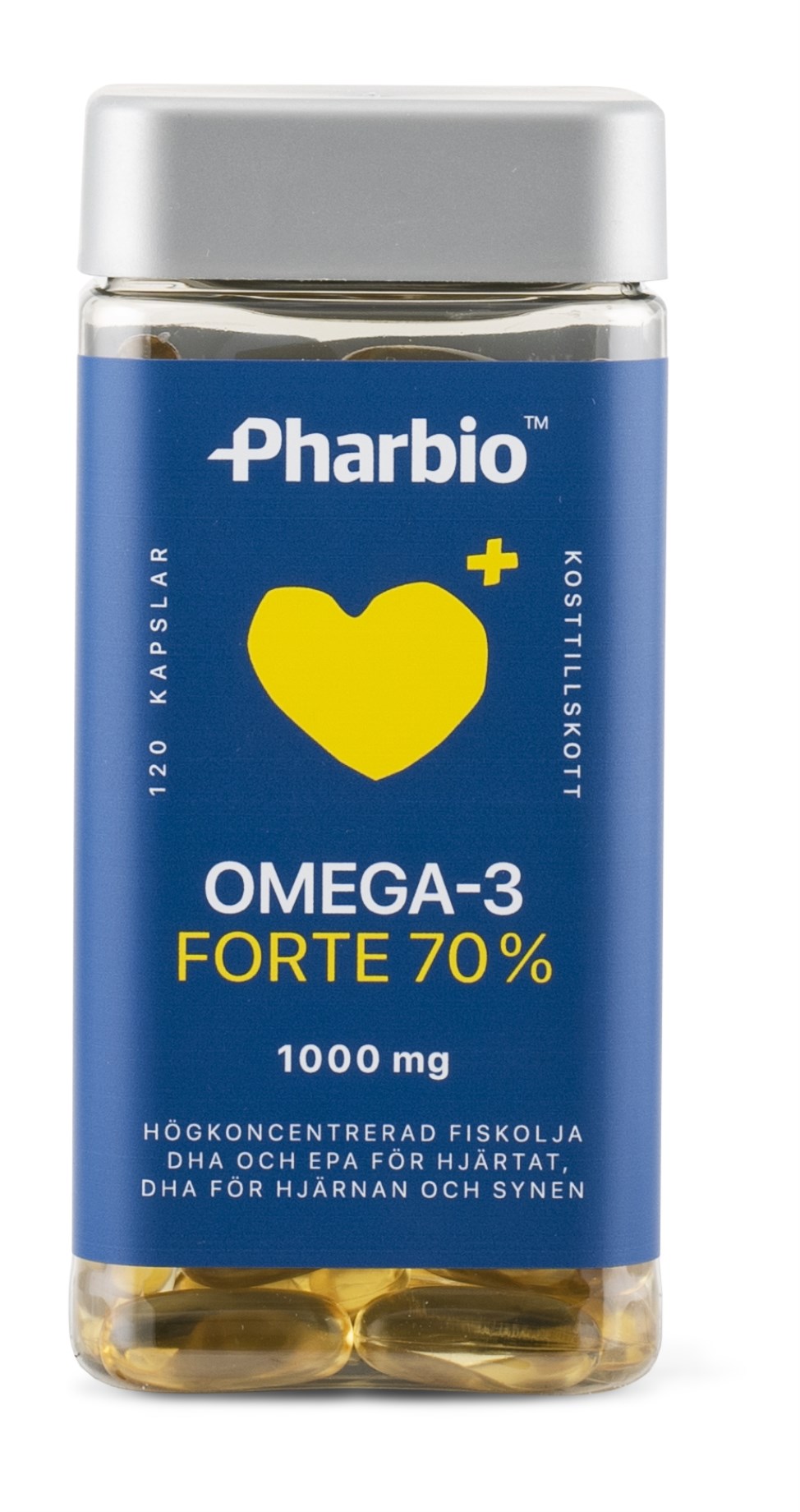 Pharbio Omega-3 Forte i kapselform innehåller hela 70 % koncentrerad omega-3. Nu med 10 % mer kapslar per burk!