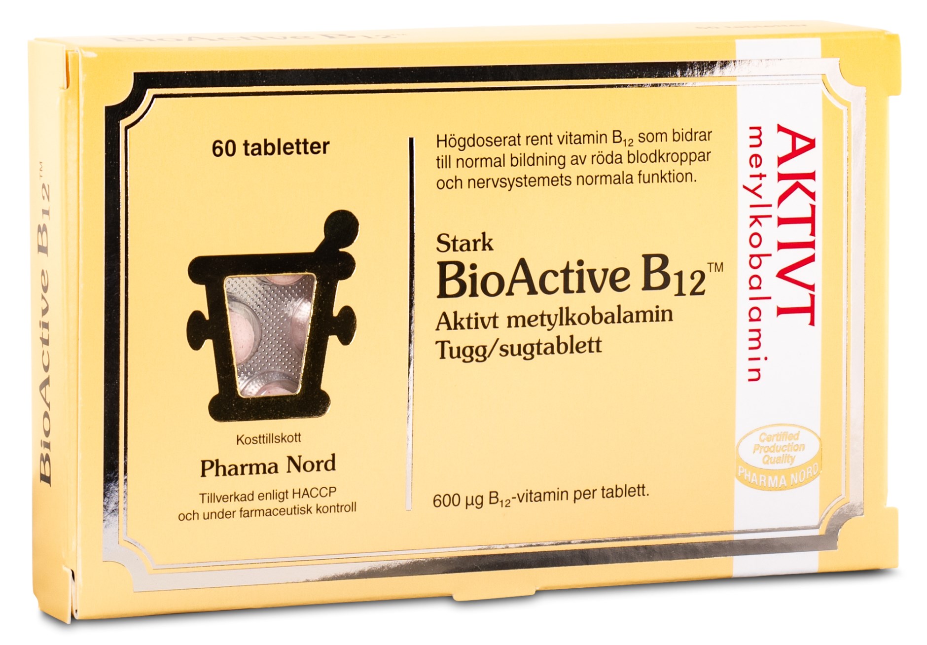 Pharma Nord BioActive B12 är ett vitamintillskott av metylkobalamin, som är vitamin B12 i dess aktiva form. Sug- och tuggtabletterna innehåller 600 mikrogram B12 per tablett och är smaksatta med frisk pepparmynta. Vitamin B12 är ett viktigt vitamin som bland annat bidrar till kroppens normala bildning av röda blodkroppar, men är även en viktig beståndsdel för ett normalfungerande nervsystem. Pharma Nord BioActive B12 är ett veganskt tillskott och kan bidra till att upprätthålla B12-nivåerna hos vegetarianer och veganer, eftersom B12 återfinns främst i kött- och mejeriprodukter.