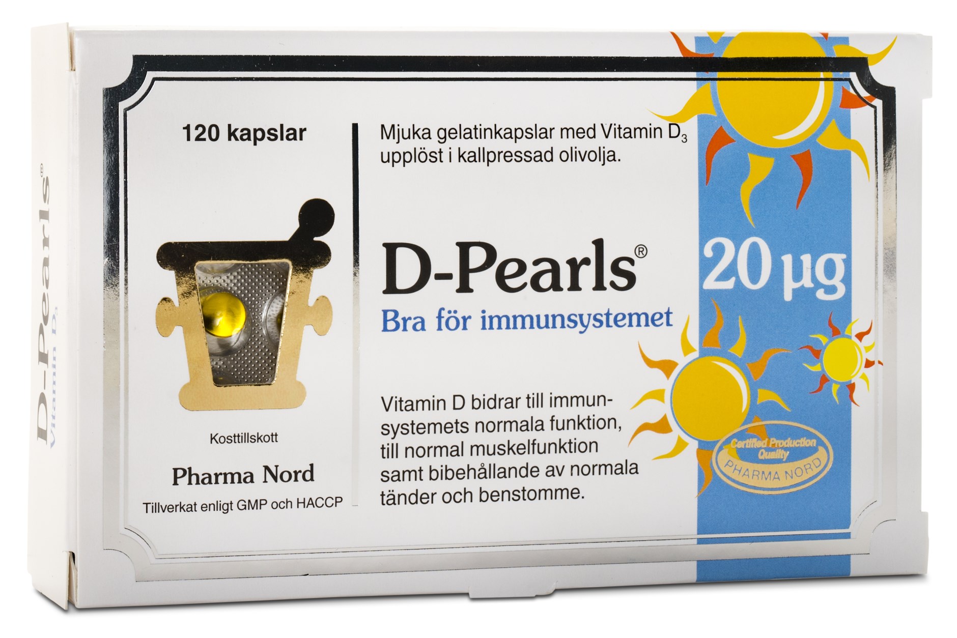 Ett lätt sätt att kompensera bristen är att ta ett bra tillskott med vitamin D. Detta är själva anledningen till att produkten D-Pearls utvecklats. Preparatet ger kroppen en jämn tillförsel av D-vitamin året runt. D-vitamin är fettlösligt och upptas endast om intaget sker i samband med fett. Därför brukar man rekommendera att ta tillskott med D-vitamin tillsammans med en fetthaltig måltid. Detta skapar problem för dem som vill undvika fet kost för att hålla vikten. Därför har Pharma Nord valt att framställa en liten rund "pärla" av mjukt gelatin fylld med ett innehåll av 20 mikrogram D-vitamin i kallpressad olivolja - en sund, välsmakande och lättupptaglig sammansättning. De små, klotrunda gelatinpärlorna är lättsvalda, men man kan också tugga dem om man så önskar. De har en angenäm smak av frisk olivolja.