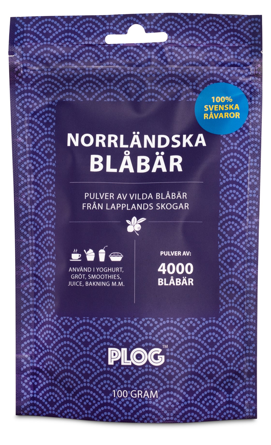 PLOG Norrländska Blåbär är ett näringsrikt pulver av blåbär. Blåbären har vuxit vilt i de lappländska skogarna och är obehandlade och varsamt torkade. Bären har torkats hela under 42 grader för att bevara alla näringsämnen. Blåbär är rikt på C-vitamin, fibrer och antioxidanten antocyanin. Av den vätska som blir över från bären görs blåbärsdryck. Det näringsrika pulvret är perfekt att använda i juice, yoghurt, smoothie eller i bakning.