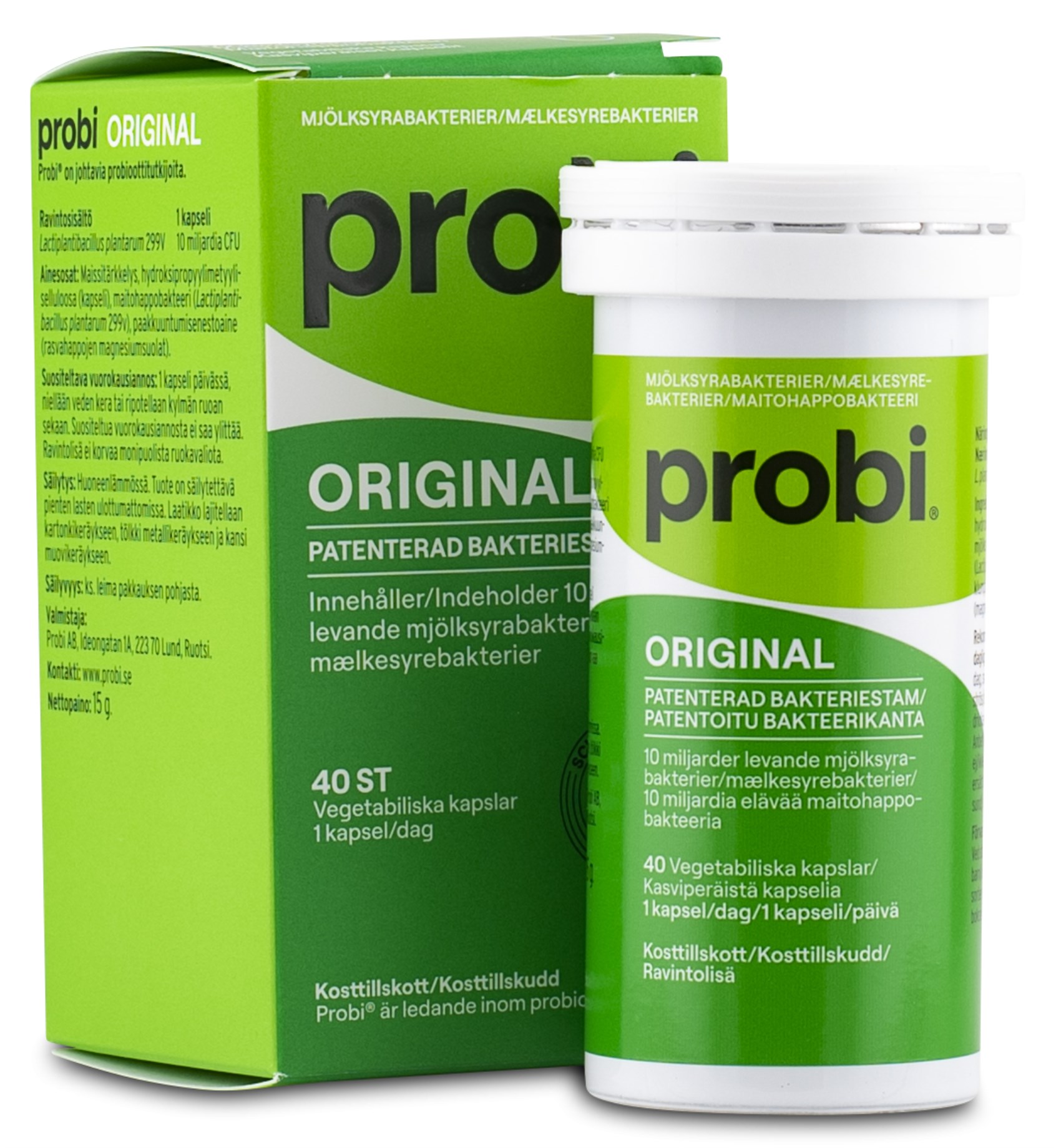 Probi Original Mjölksyrabakterier innehåller den patenterade och väldokumenterade bakteriestammen Lactiplantibacillus plantarum 299v (LP299V®), vilket är en stam som testats i flertalet kliniska studier. Probi Original kan överleva passagen genom matsmältningen och stanna kvar i tarmen. Kapslarna är vegetabiliska och glutenfria och går att svälja hela eller öppna och strö över kall eller rumstempererad mat eller dryck. Passar för hela familjen och kan intas från 3 års ålder.
