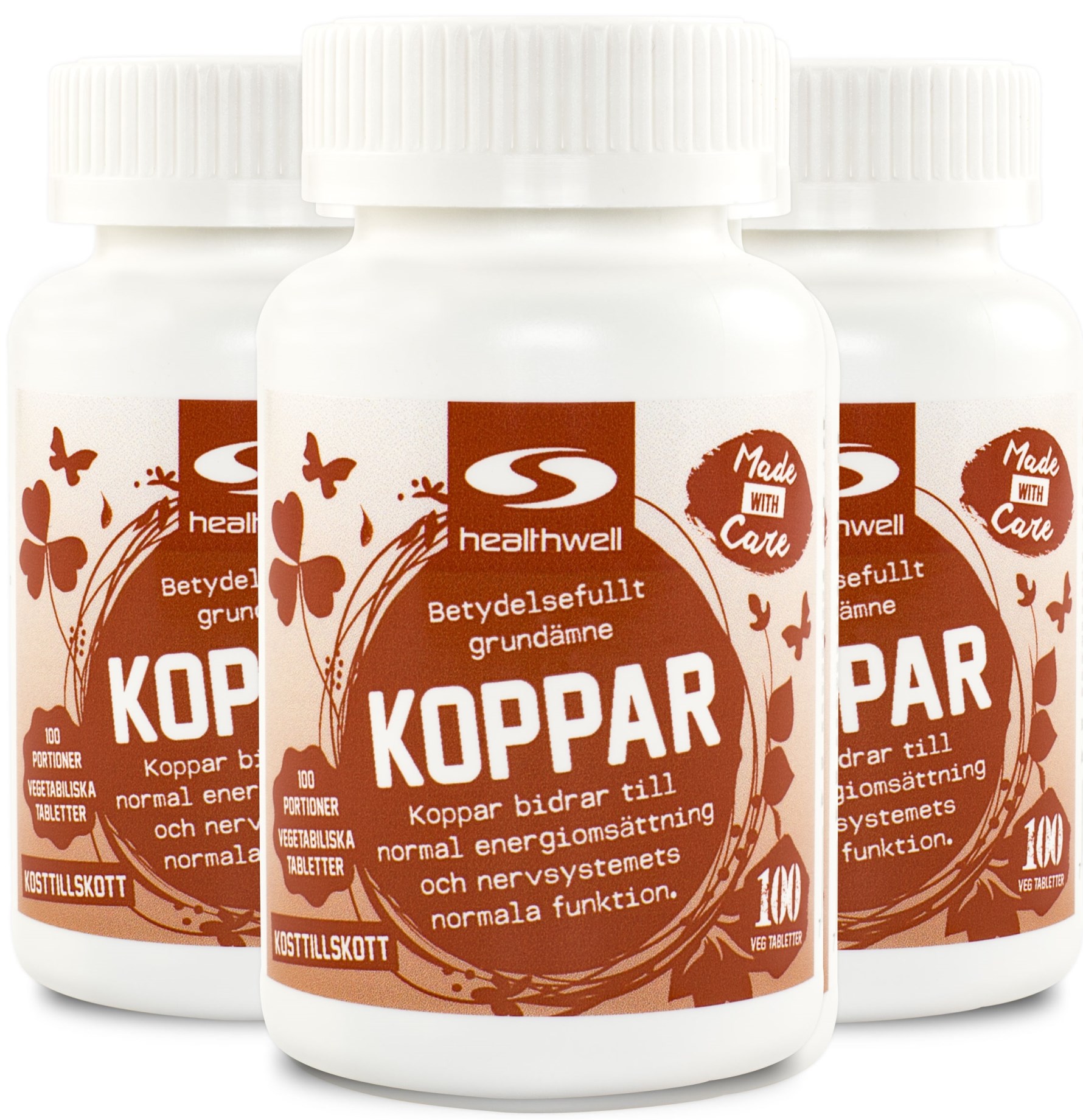 Koppar 3-pack innehåller tre burkar Koppar, med totalt 300 portioner. Flerpacket ger ett bättre styckpris och underlättar för dig som använder tillskottet dagligen och vill ha ett lager hemma.