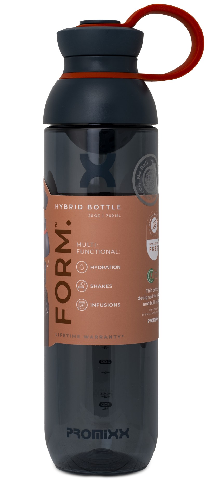 PROMiXX Form Hybrid Bottle är en praktisk, funktionell flaska för både vardag och träning. Den är tillverkad i ECOZEN™, ett biobaserat och ultratåligt plastmaterial utan hormonstörande ämnen, som ger en ren smakupplevelse i varje klunk. Flaskan är både lukt- och smakresistent, och du rengör den enkelt för hand eller i diskmaskinen. Flaskan rymmer 760 ml och har ett smidigt lock med integrerad bärloop som är smidig i handen. Med Form Hybrid Bottle kan du enkelt blanda proteinpulver och andra pulver smidigt, tack vare det smarta snap-fit-agitatorsystemet. Självklart är flaskan också helt läckagesäker. En allt-i-ett-flaska för proteinshakes, EAA, vatten och smoothies!