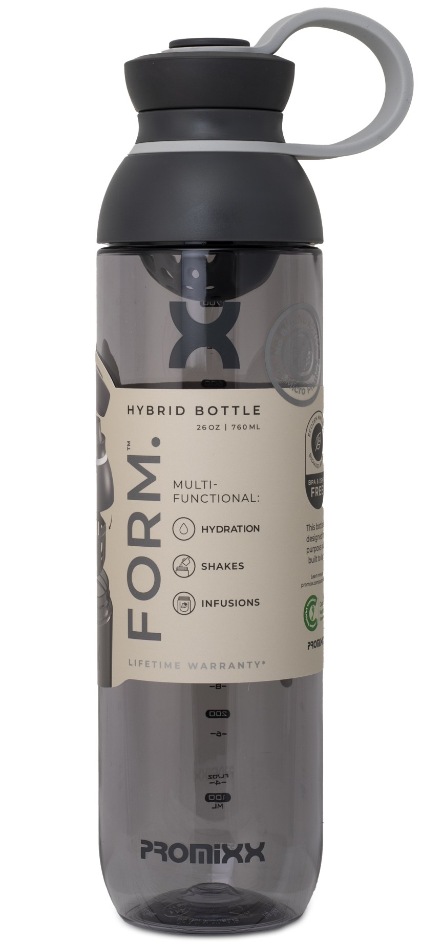 PROMiXX Form Hybrid Bottle är en praktisk, funktionell flaska för både vardag och träning. Den är tillverkad i ECOZEN™, ett biobaserat och ultratåligt plastmaterial utan hormonstörande ämnen, som ger en ren smakupplevelse i varje klunk. Flaskan är både lukt- och smakresistent, och du rengör den enkelt för hand eller i diskmaskinen. Flaskan rymmer 760 ml och har ett smidigt lock med integrerad bärloop som är smidig i handen. Med Form Hybrid Bottle kan du enkelt blanda proteinpulver och andra pulver smidigt, tack vare det smarta snap-fit-agitatorsystemet. Självklart är flaskan också helt läckagesäker. En allt-i-ett-flaska för proteinshakes, EAA, vatten och smoothies!