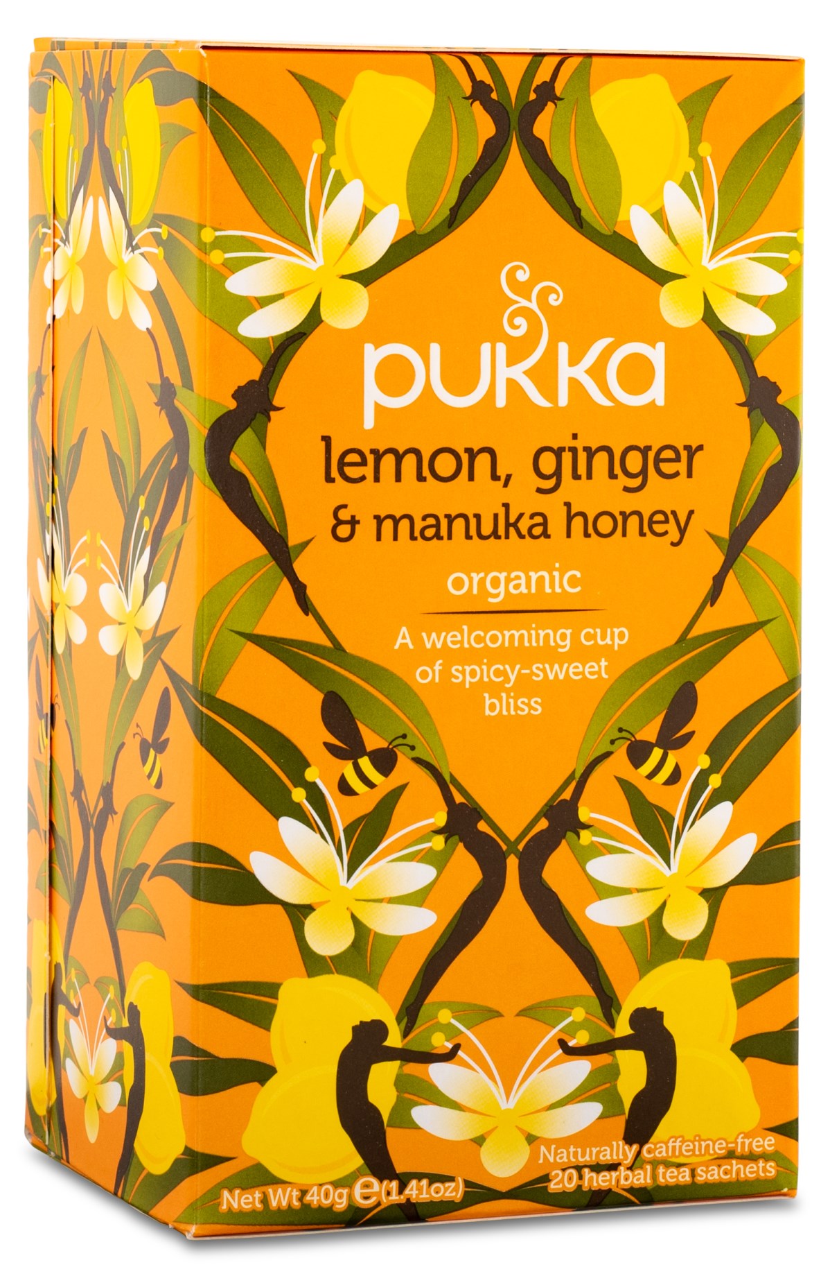 Pukka Te Lemon, Ginger & Manuka Honey är en perfekt blandning av sött och kryddigt i en värmande kombination - som en varm kram. Den smakrika ingefäran blandas med syrlig citron för att friska upp sinnet, innan manukahonungen tillsätts för att bidra med en liten sötma i det sura och starka. Ett lugnande, välgörande te som är naturligt fritt från koffein och därför kan avnjutas även kvällstid utan att det känns svårt att somna.