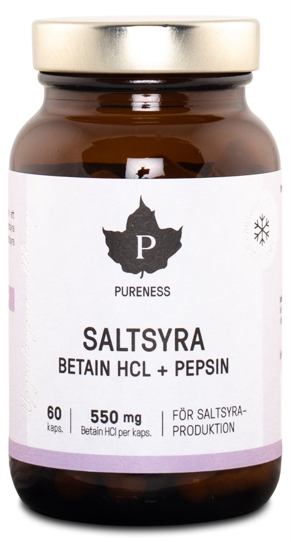 Pureness Betain HCL är ett kosttillskott med betain HCL och pepsin som främjar kroppens egen produktion av saltsyra. Saltsyra är viktigt för att magsäcken ska kunna arbeta optimalt och för att vi ska ta upp näringsämnen på ett bra sätt. Om kroppen har för låg produktion av saltsyra kan det orsaka matsmältnings- och magproblem, till exempel halsbränna, vilket mycket troligt kan bero på brist av saltsyra. Pureness Betain HCL innehåller inga tillsatser och fyllnadsmedel.
