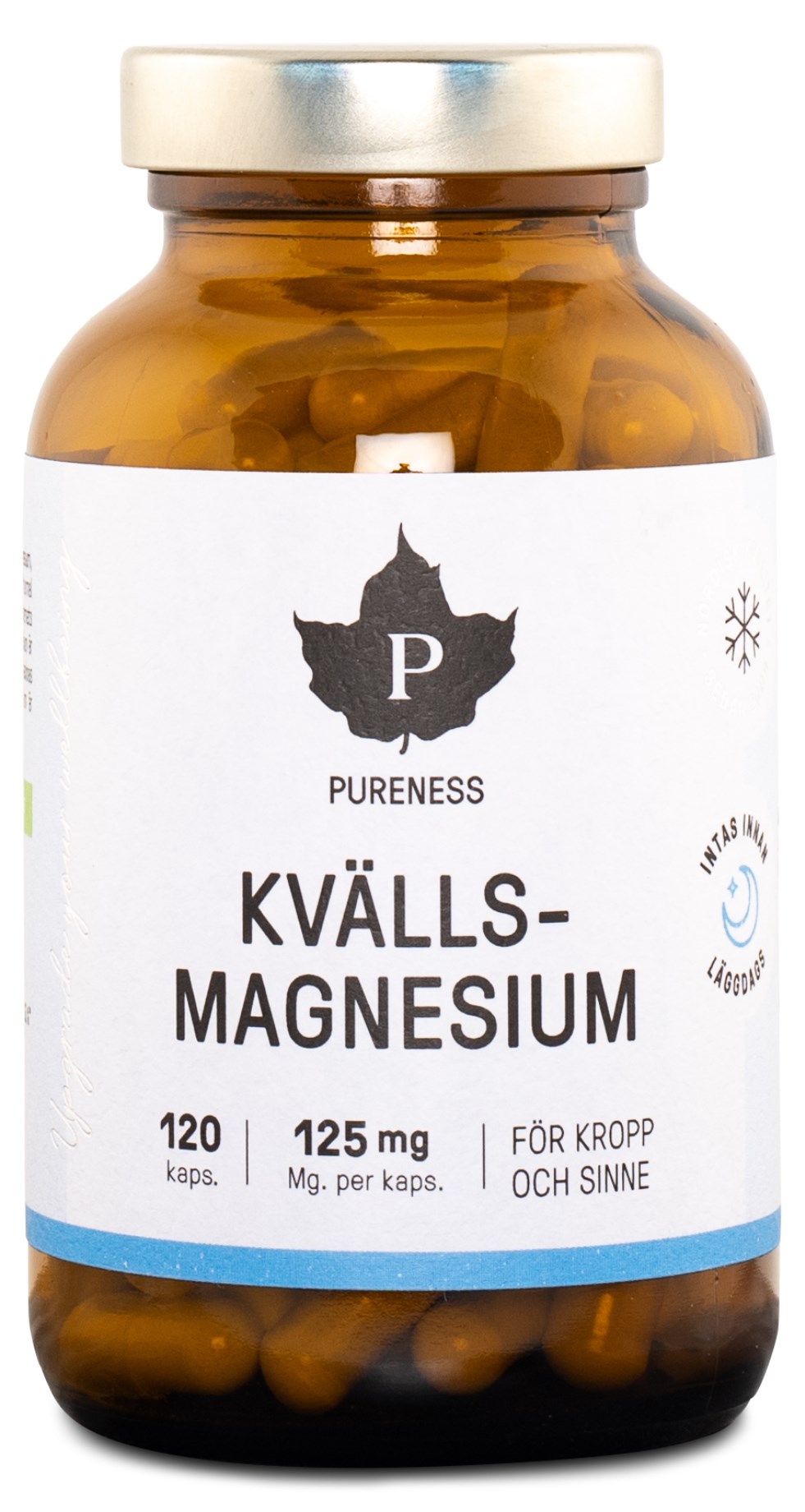 Optimera din sömn med Pureness Kvällsmagnesium, ett kosttillskott framtaget för att bidra till bättre sömn. Tillskottet innehåller magnesiumbisglycinat, en magnesiumform som är väldigt magvänlig samt med fördel tas på kvällen då den kan ha en lugnande effekt på kroppen. Pureness Kvällsmagnesium innehåller även kamomillblomma, en ört som länge använts i avslappnande syften, samt aminosyran L-teanin. L-teanin finns naturligt i grönt te och tros ha en effekt på neurotransmittorerna dopamin och serotonin. Kosttillskottet kommer i kapselform.