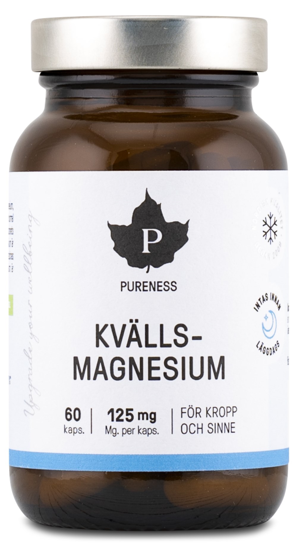 Optimera din sömn med Pureness Kvällsmagnesium, ett kosttillskott framtaget för att bidra till bättre sömn. Tillskottet innehåller magnesiumbisglycinat, en magnesiumform som är väldigt magvänlig samt med fördel tas på kvällen då den kan ha en lugnande effekt på kroppen. Pureness Kvällsmagnesium innehåller även kamomillblomma, en ört som länge använts i avslappnande syften, samt aminosyran L-teanin. L-teanin finns naturligt i grönt te och tros ha en effekt på neurotransmittorerna dopamin och serotonin. Kosttillskottet kommer i kapselform.