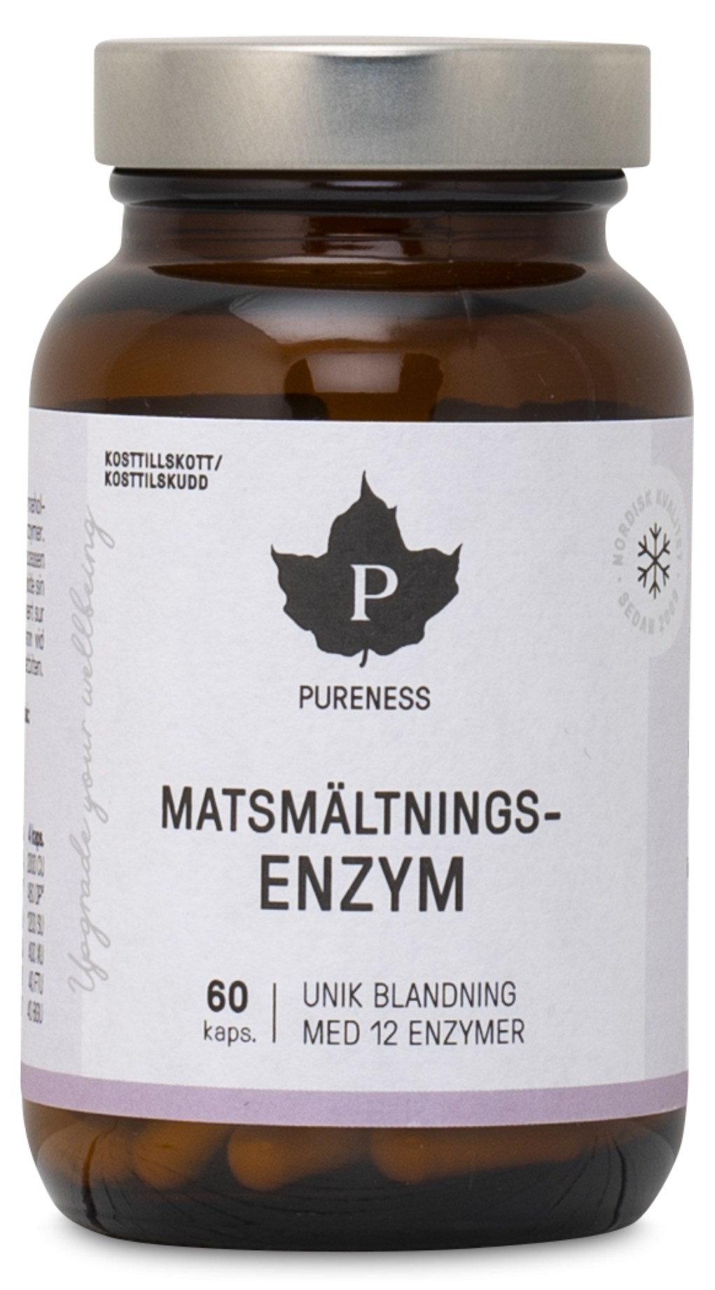Pureness Matsmältningsenzym är ett kosttillskott med noggrant utvalda enzymer för matsmältningen. Matsmältningsenzymer hjälper till att bryta ner protein, fett och kolhydrater i kroppen och gör att maten omvandlas till näring. Det finns flera olika sorters matsmältningsenzymer, och i Pureness Matsmältningsenzym har man tillsatt ett antal noggrant antal utvalda enzymstammar. Tillskottet är dessutom utvecklat med en speciell teknik som säkerställer att enzymerna behåller sin funktion både i en mycket sur och en mycket alkalisk miljö. Dosering är 1 kapsel innan måltid, och effekten märks redan efter första användningen.