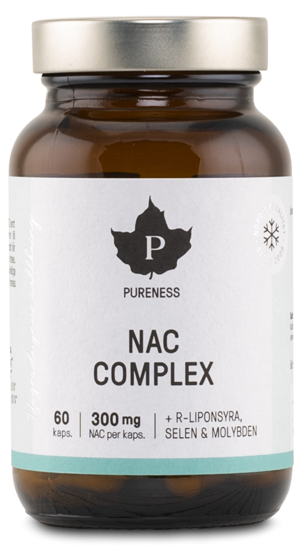 Pureness NAC Complex är ett högkvalitativt aminosyrapreparat som innehåller N-acetyl-L-cystein (NAC) samt aktiv R-liponsyra, selen och molybden. Selen bidrar till immunsystemets normala funktion, till att bibehålla normalt hår och normala naglar, samt skydda cellerna mot oxidativ stress. Molybden bidrar till normal omsättning av svavelhaltiga aminosyror. Kombinera gärna NAC Complex med Pureness C-vitamintillskott.