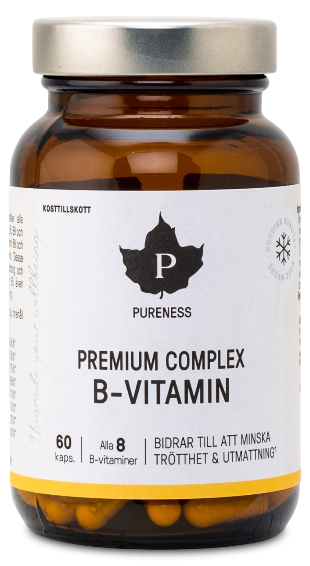 Pureness Premium Complex B-vitamin innehåller aktiva B-vitaminer (B1, B2, B3, B5, B6, B7, B9 och B12) i en och samma kapsel. Niacin, tiamin, riboflavin, vitamin B6 och B12 bidrar till nervsystemets normala funktion. Dessa vitaminer bidrar även till normal energiomsättning och bidrar till att minska trötthet och utmattning. B9, även kallat folsyra, spelar en roll för kroppens celldelning.