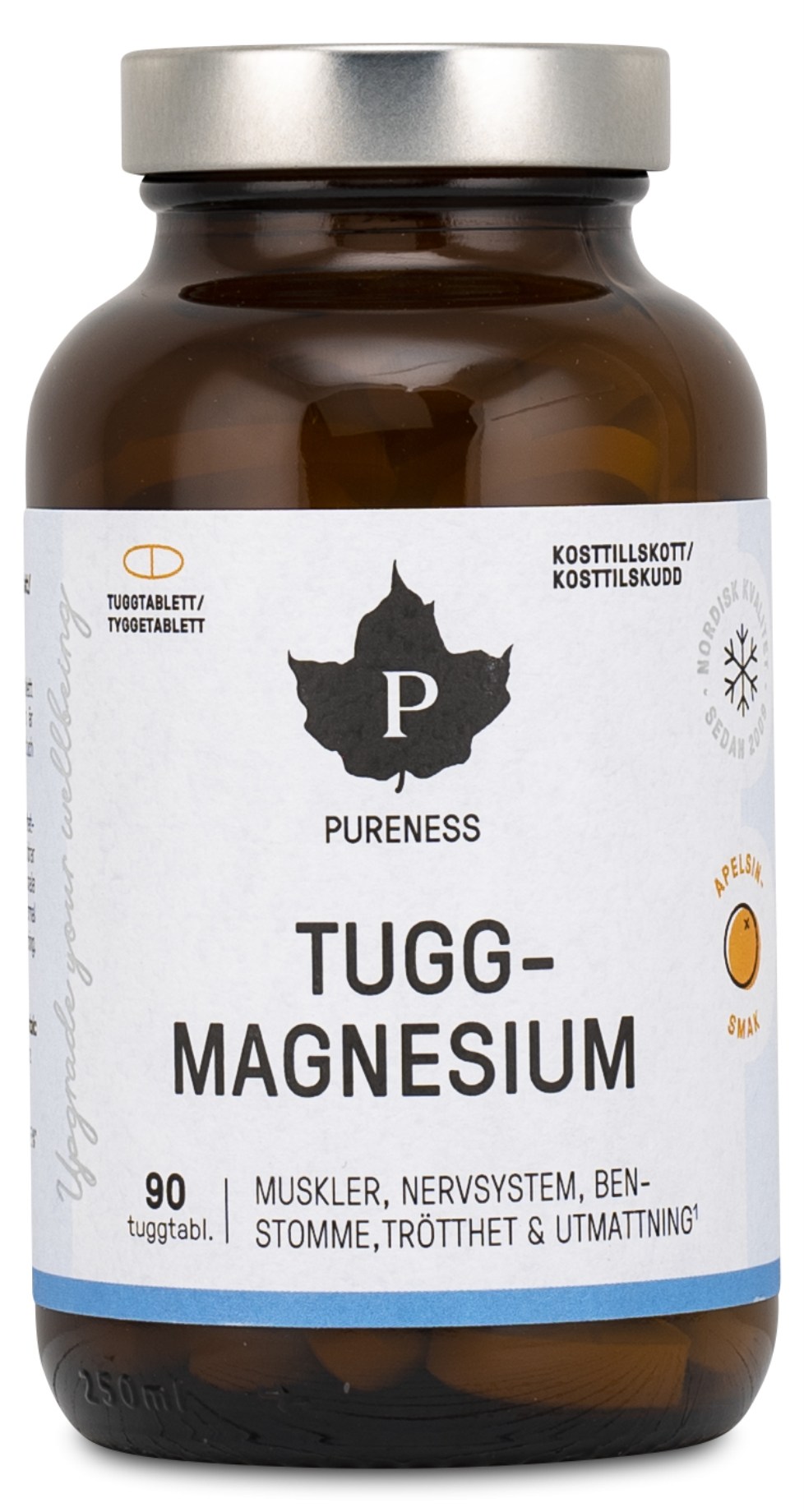 Pureness Tuggmagnesium är en praktisk och god tuggtablett med magnesiummalat – en skonsam och högkvalitativ form av magnesium. Magnesium hjälper till att minska trötthet och utmattning samt stödjer normal muskel- och nervfunktion. Med en frisk smak av apelsin är den ett perfekt val för dig som vill ha ett smidigt alternativ till vanliga tabletter.