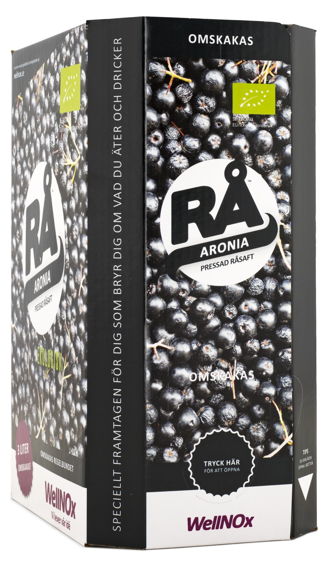 RÅ Aronia är en juice med aroniabär, osötad och helt fri från tillsatser. Juicen är pastöriserad för säkerhet och bättre hållbarhet. Den fantastiska bag-in-boxen ger en tät förslutning så att juicen håller sig fräsch länge, minst en månad efter öppning.