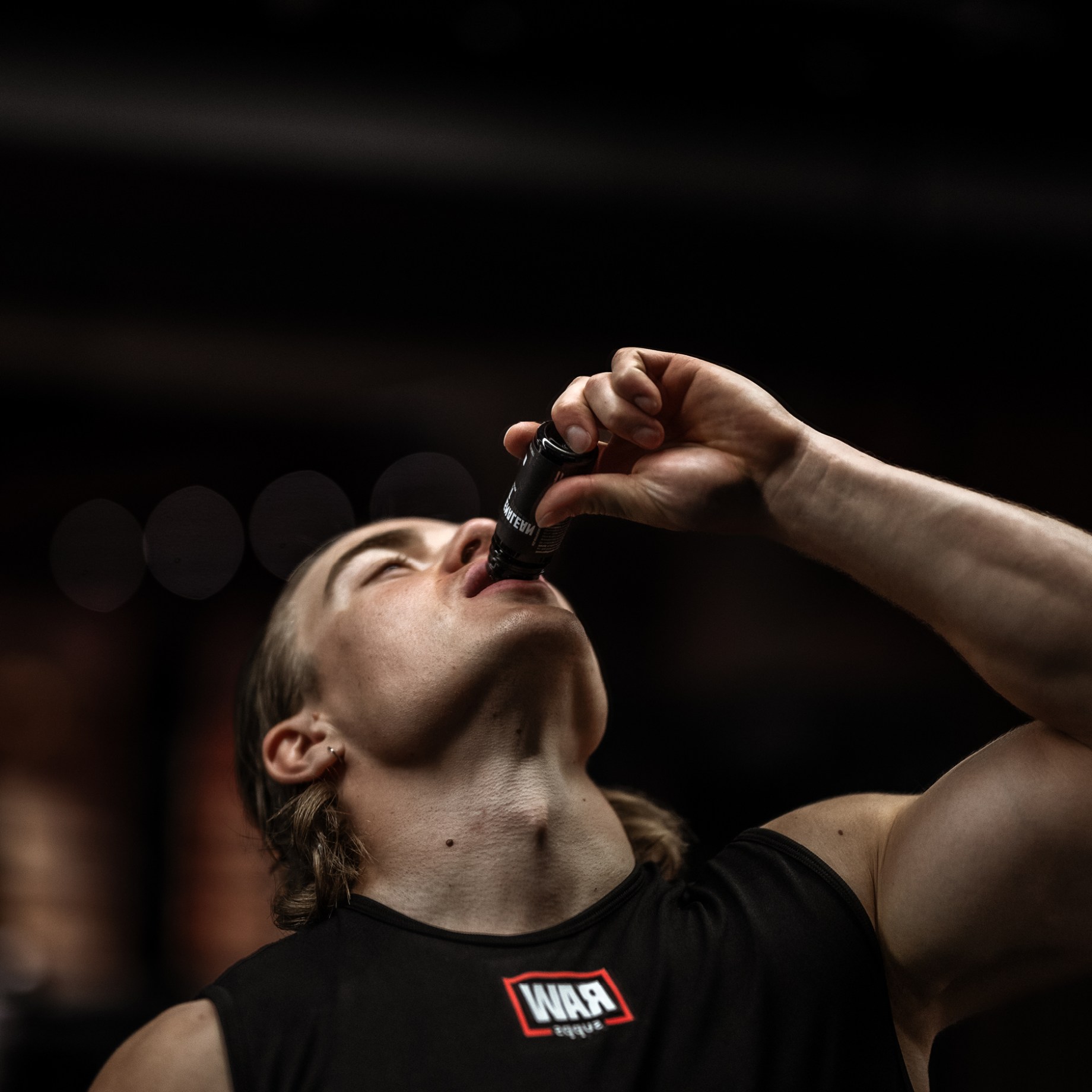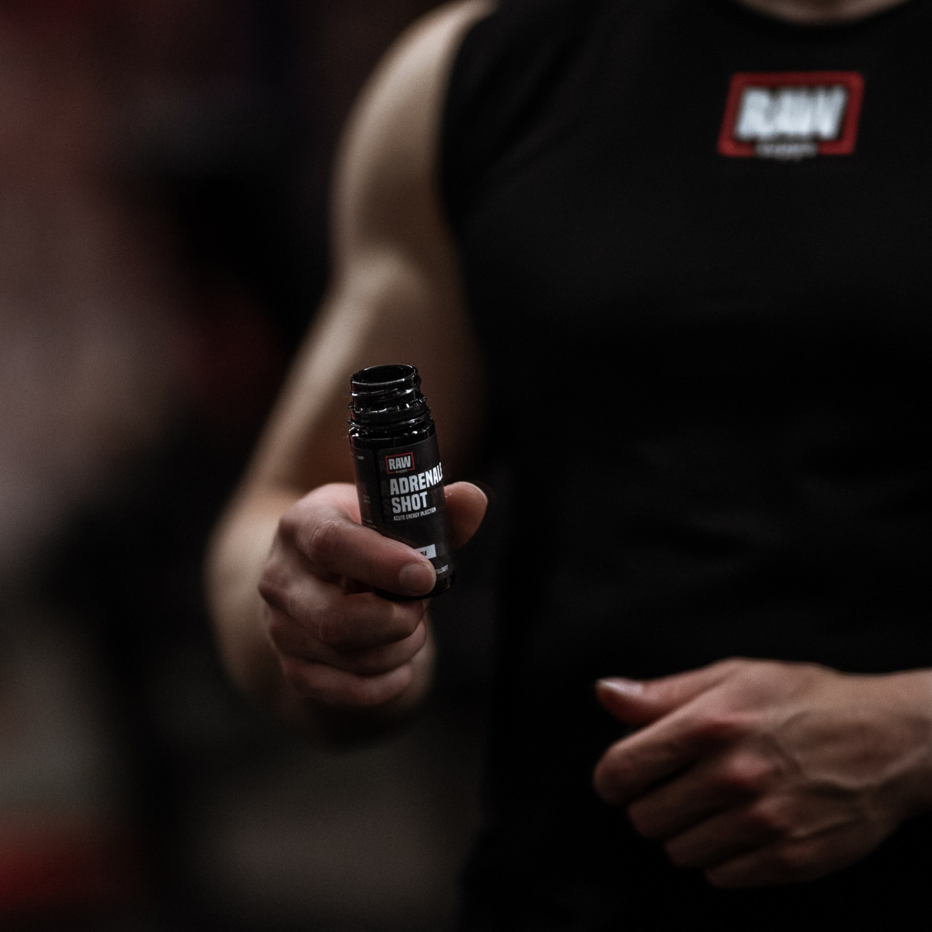Två händer håller en RAW SUPPS Adrenalean Shot med nyligen öppnad kork, redo att drickas.En PWO-shot som ger dig energikicken du behöver!