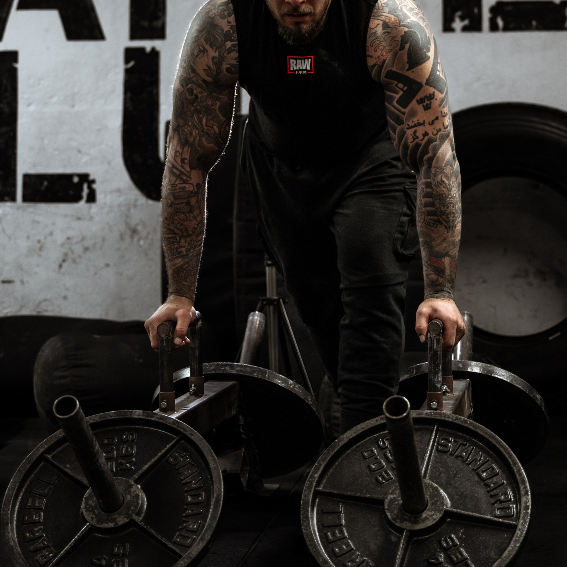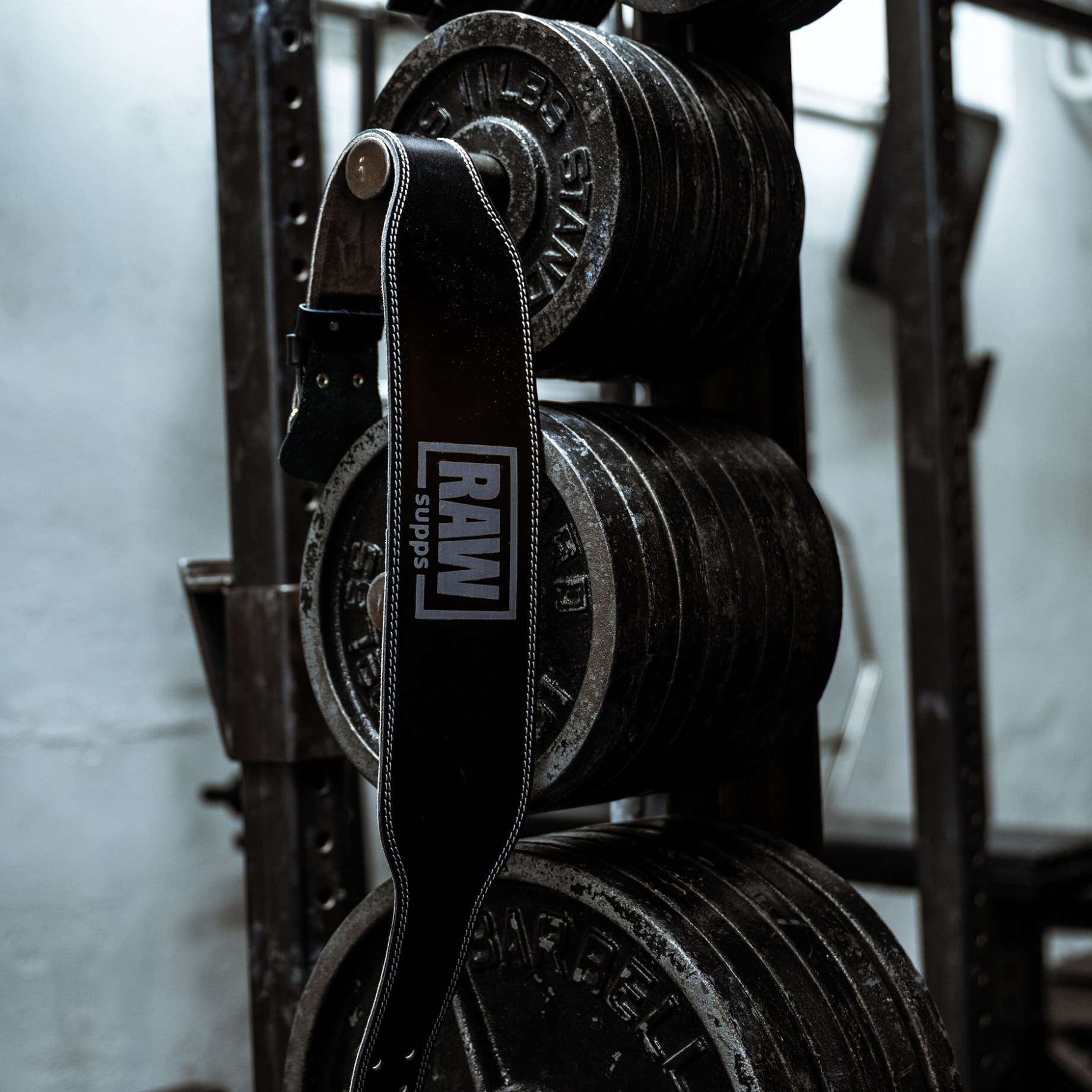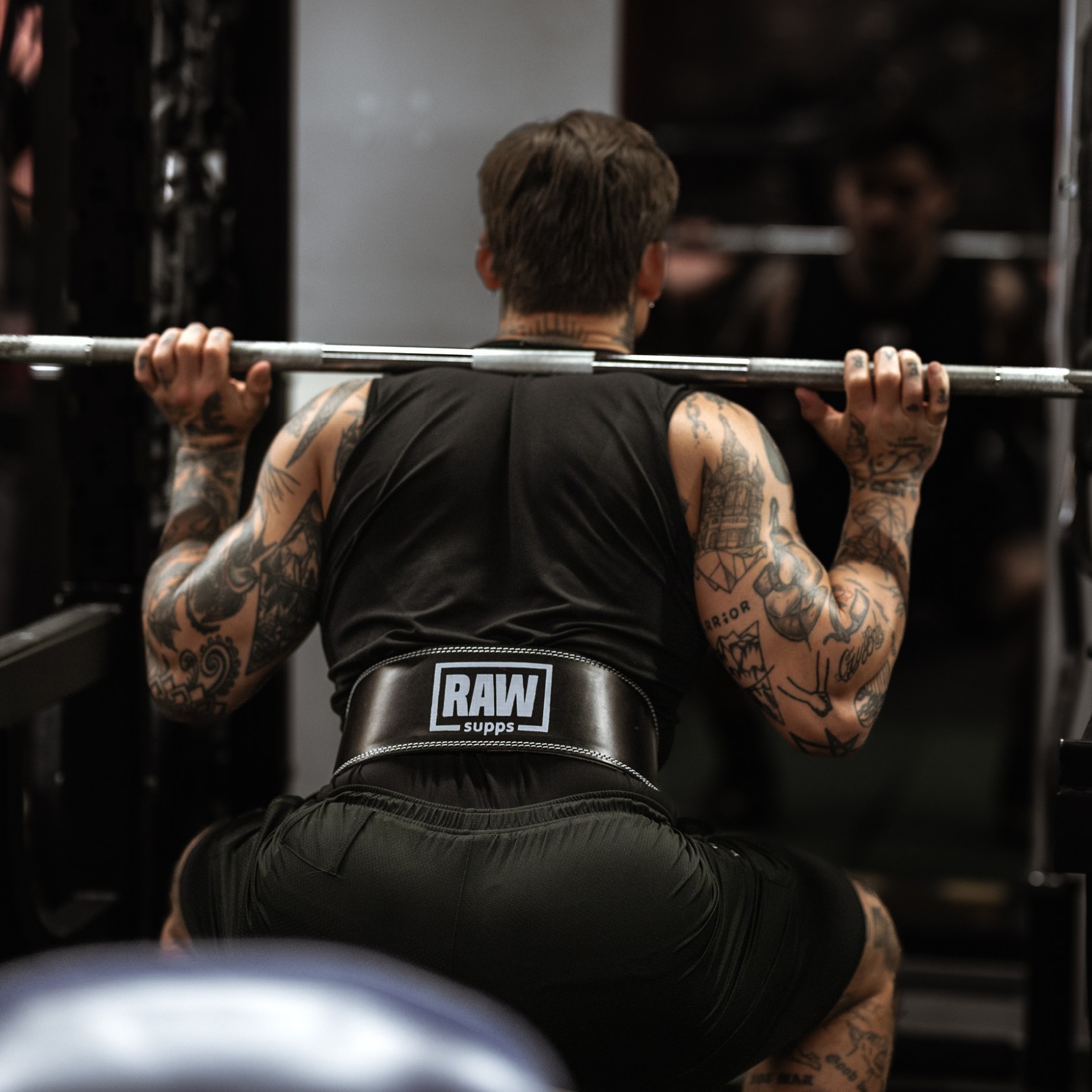 En man har på sig RAW SUPPS Bodybuilding Belt och gör sig redo för knäböj.Känn dig säker i dina tyngsta lyft med RAW Bodybuilding Belt!