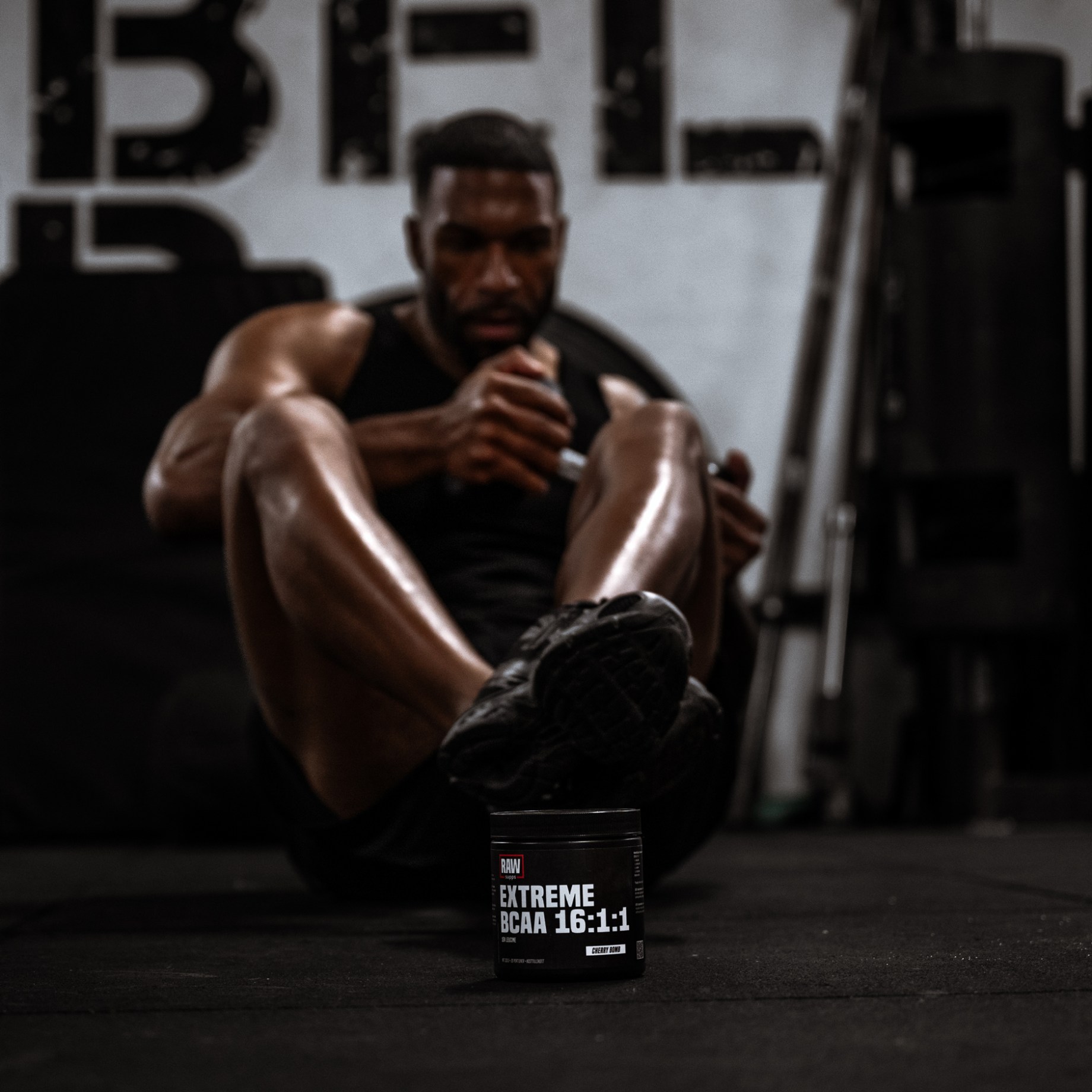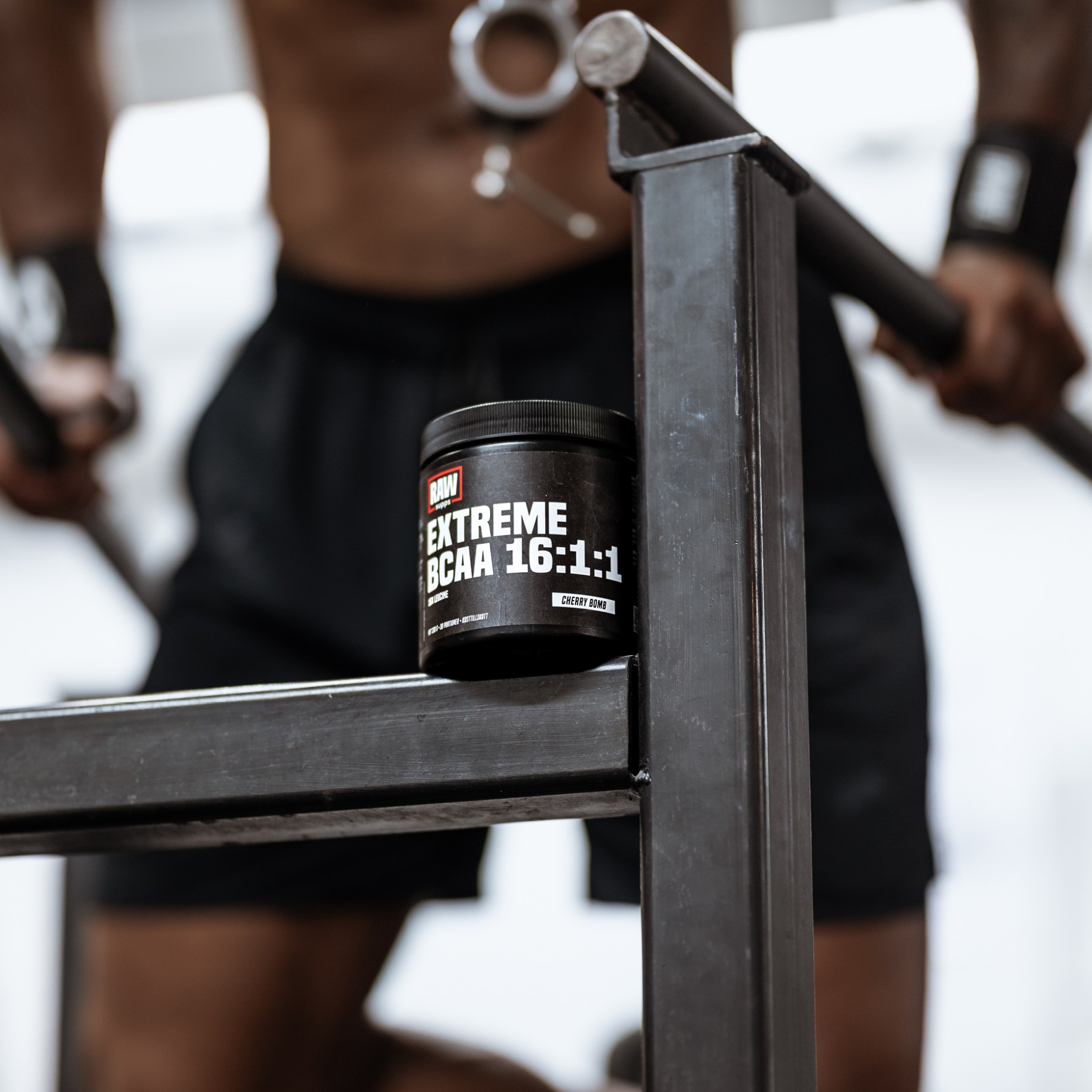 RAW SUPPS Extreme BCAA 16:1:1 i fokus, med en man i bakgrunden som utför dips med kedjor runt halsen.BCAA för optimala förutsättningar för muskeluppbyggnad och återhämtning.