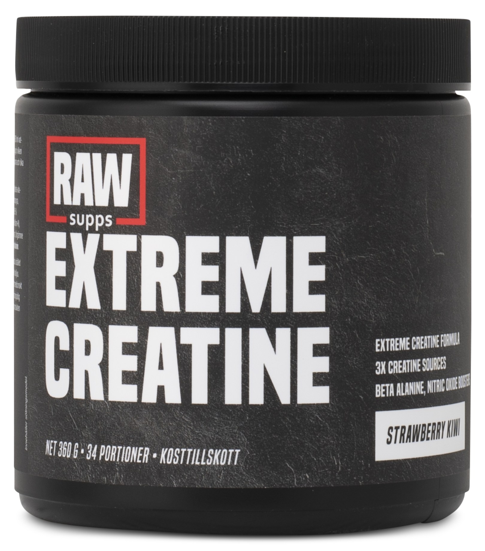 Kreatin fungerar som en extra energikälla till dina muskler och ökar den fysiska prestationen vid upprepad kraftansträngning i samband med träning, du får även snabbare återhämtning. Den gynnsamma effekten av kreatin uppnås vid ett dagligt intag av minst 3 g kreatin(1). Med RAW Extreme Creatine uppnår du den mängden med en portion. Kreatin lämpar sig till alla bodybuilders och atleter som vill säkerställa sin prestationsförmåga och har som mål att bygga på sig mer massa, bli starkare, gå upp i vikt eller få bättre uthållighet. RAW Extreme Creatine hjälper dig att ta din träning mot nya höjder och fungerar även utmärkt som stimfri PWO innan träning.