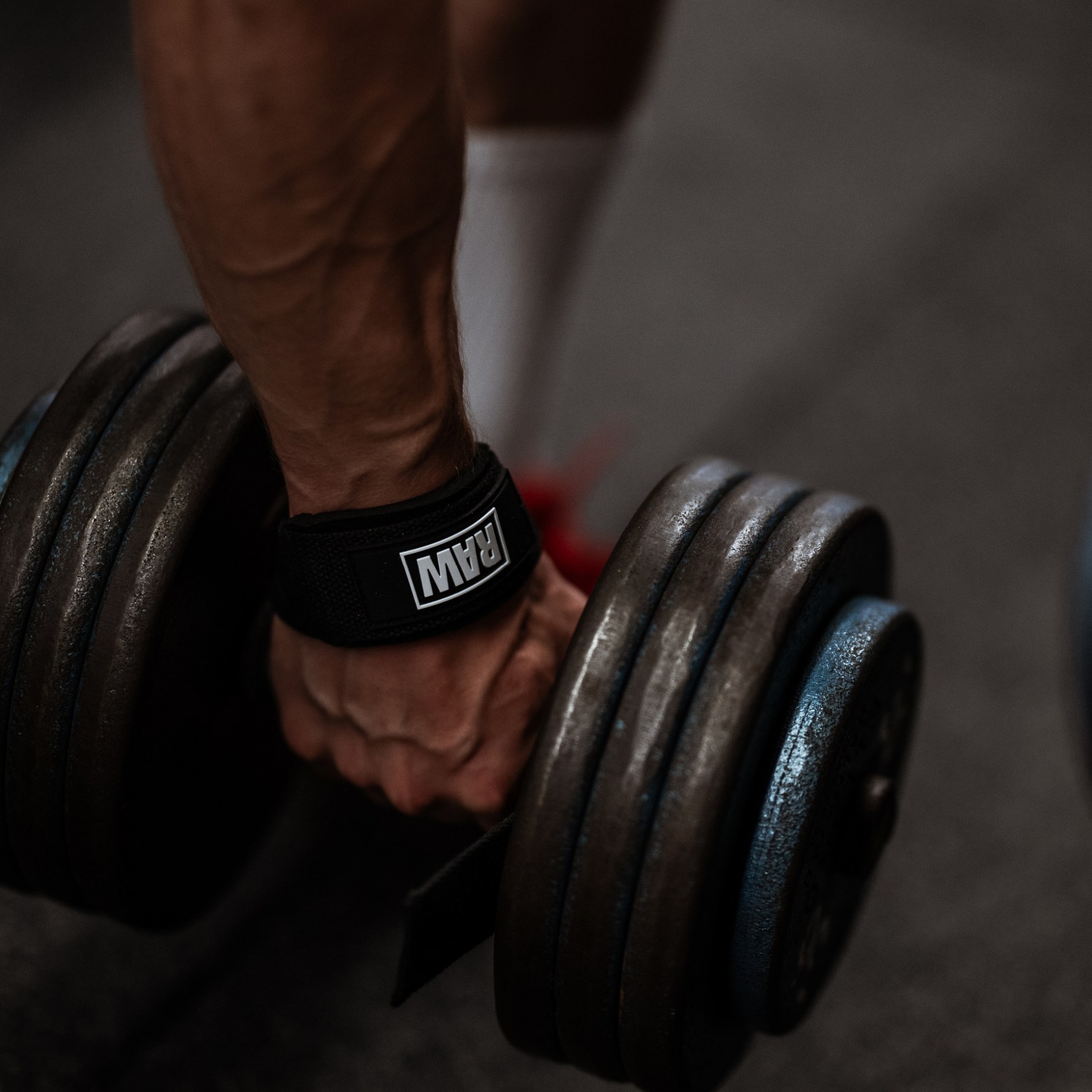 Två händer använder RAW Lifting Straps och lindar dem runt en stång, redo att göra ett tungt lyft.Låt inte greppet stoppa dig och lyft tyngre med RAW Lifting Straps.
