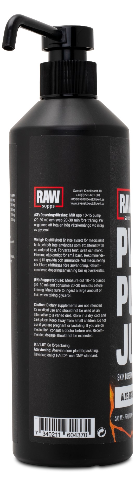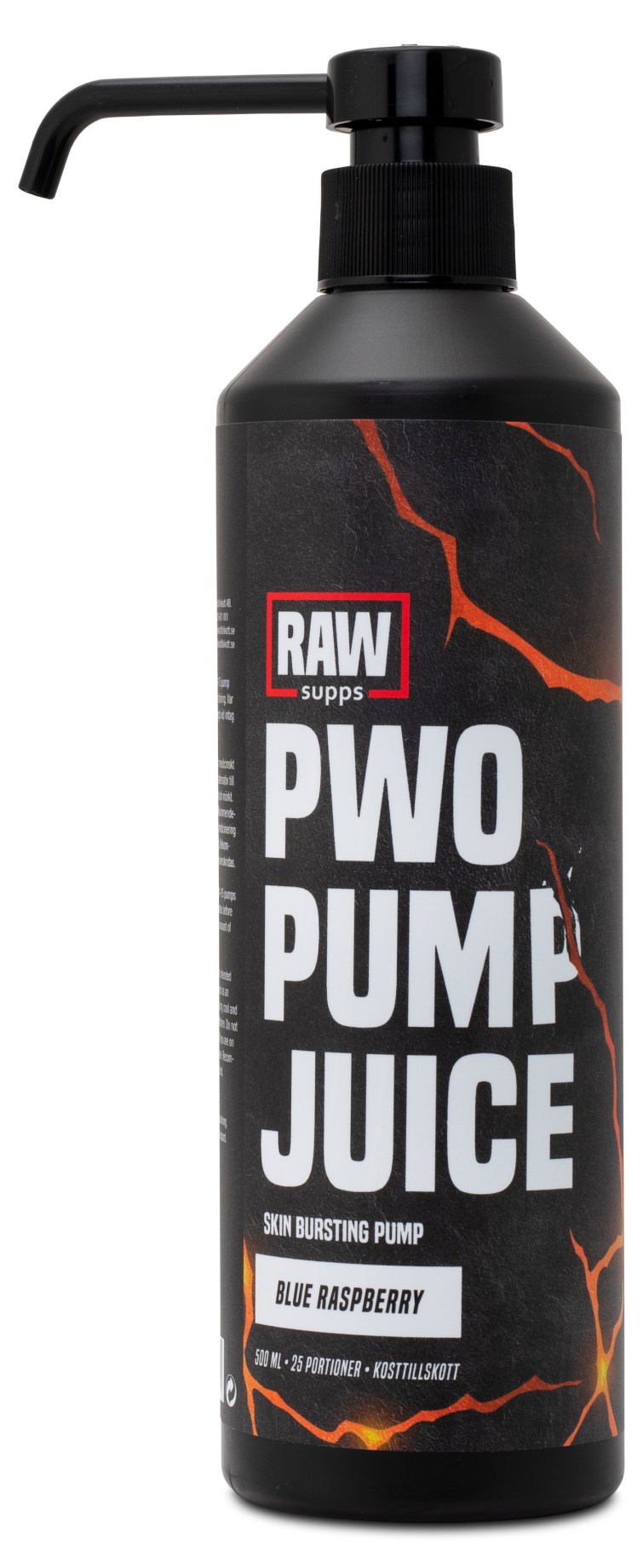 RAW PWO Pump Juice är för dig som vill känna trycket på riktigt! Den ger dig pump i två bemärkelser: muskelpumpen du jagar i gymmet och den färdiga shoten direkt från pumpflaskan. RAW PWO Pump Juice kombinerar glycerol, citrullin och AAKG för maxat tryck i varje repetition, med ådror som poppar och muskler som känns fylliga, för en känsla av rå styrka – helt utan koffein. Smaken Blue Raspberry är sur och salt för en rejäl kick!