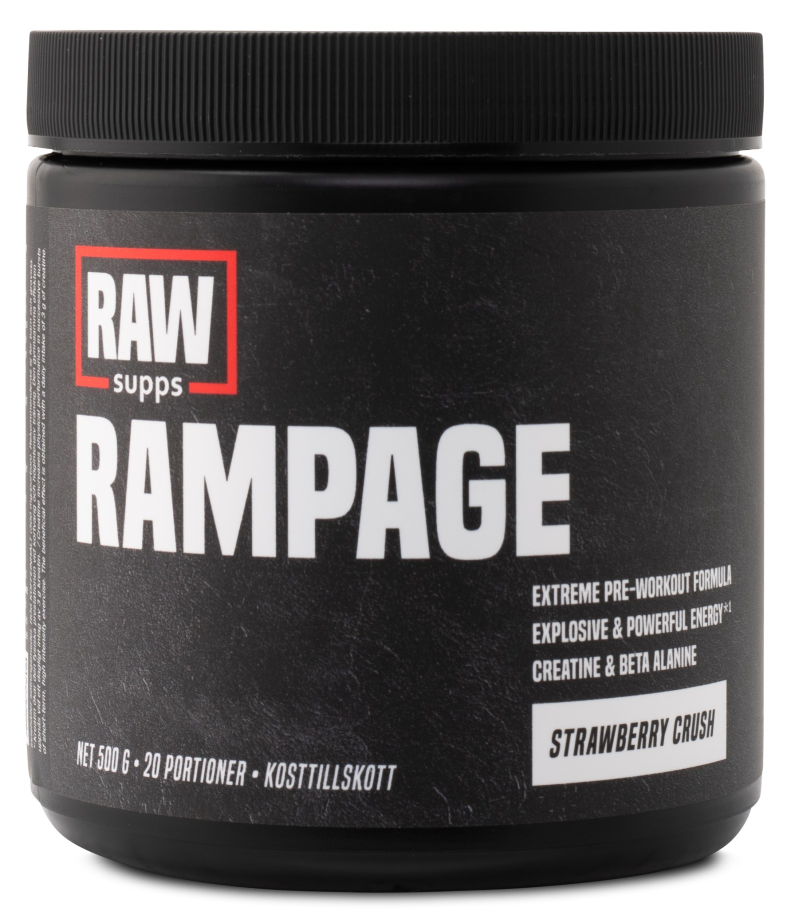 RAW Rampage är en av våra mest populära pre-workoutprodukter, högt värderad för sin kraftfulla formula och goda smak. En extrem PWO-formula för explosiv energi och råstyrka, med bland annat kreatin och beta-alanin i spetsen. RAW Rampage är framtagen för dig som vill ge ditt yttersta på träningen, har höga mål och ger 110 % under varje träningspass. Upplev ursinnet i dig själv med RAW Rampage!