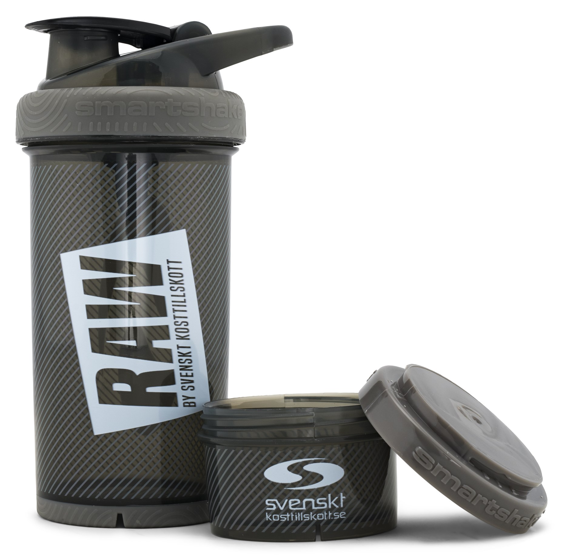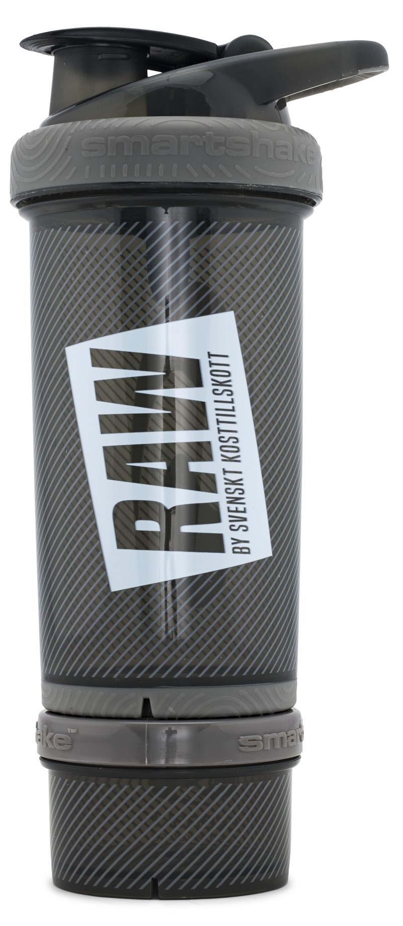 Raw Shaker har flera smart funktioner och ett mjukt handtag på locket vilket gör den smidig att bära med sig. Du får även ett extra bra grepp tack vare en stabil gummikant. För att kunna mixa en välblandad proteindrink finns ett bra mixernät och givetvis en extra behållare nertill för extra proteinpulver, kapslar, tabletter, bcaa eller snacks. Mixernätet är dessutom så effektivt att det mixar proteinpulver men ägg och pannkakssmet utan några svårigheter. Nätet har vassa sporrar som enkelt blandar frukt och bär vilket är perfekt om du vill smaksätta ditt vatten eller din dryck. Perfekt shaker att både ha på gymmet, hemma och på jobbet.