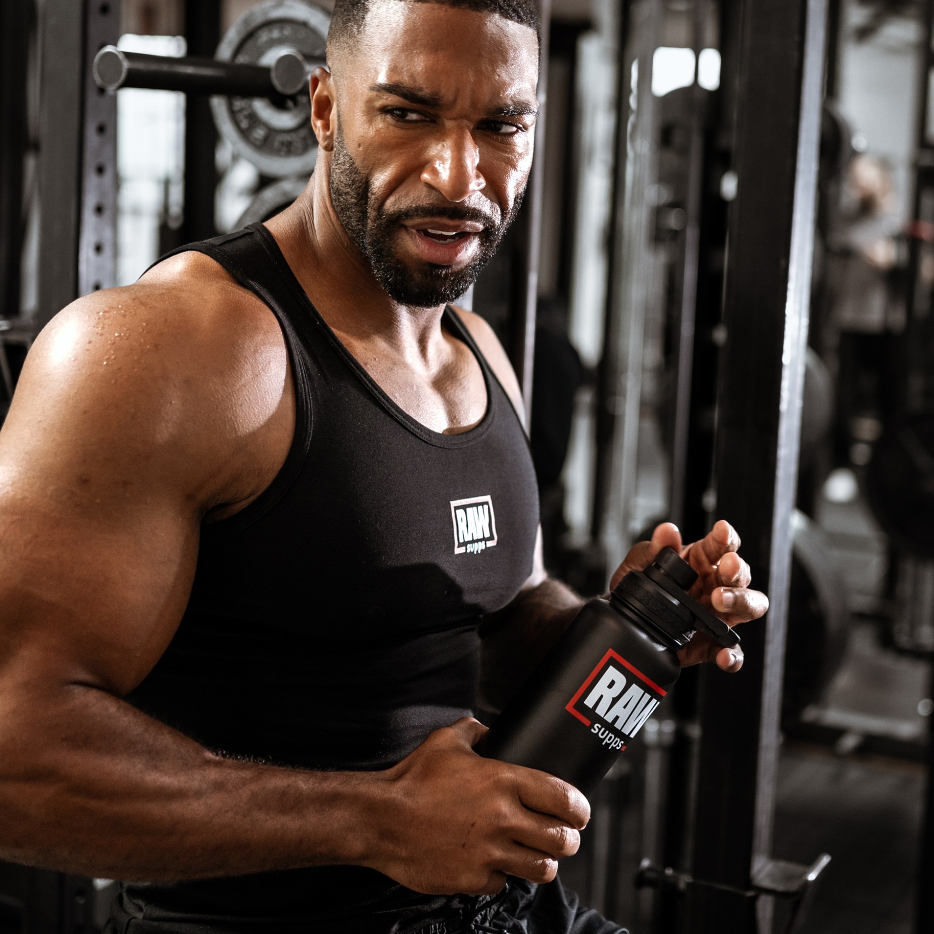 En man håller RAW SUPPS Insulated Sports Bottle i gymmiljö.Håll törsten i schack med RAW Supps Insulated Sports Bottle.