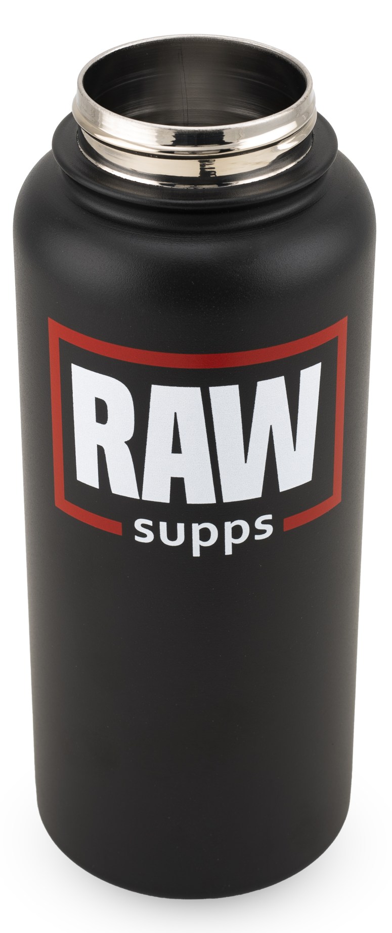 Med RAW Supps Insulated Sports Bottle är det lätt att hålla törsten i schack även vid de hårdaste, längsta passen! Sports Bottle är sportflaskan som håller närmare en liter dryck vid den perfekta temperaturen; varma drycker i upp till 12 timmar och kalla drycker i upp till 24 timmar. Livsmedelsklassat 18/8 rostfritt stål säkrar en långvarig hållbarhet för din dryck. Flaskan har ett smidigt handtag som gör den enkel att bära, och dessutom är korken läckagesäker. Upplev RAW Supps Insulated Sports Bottle – en flaska som är robust, håller rätt temperatur och inte ger vika på sin funktionalitet!