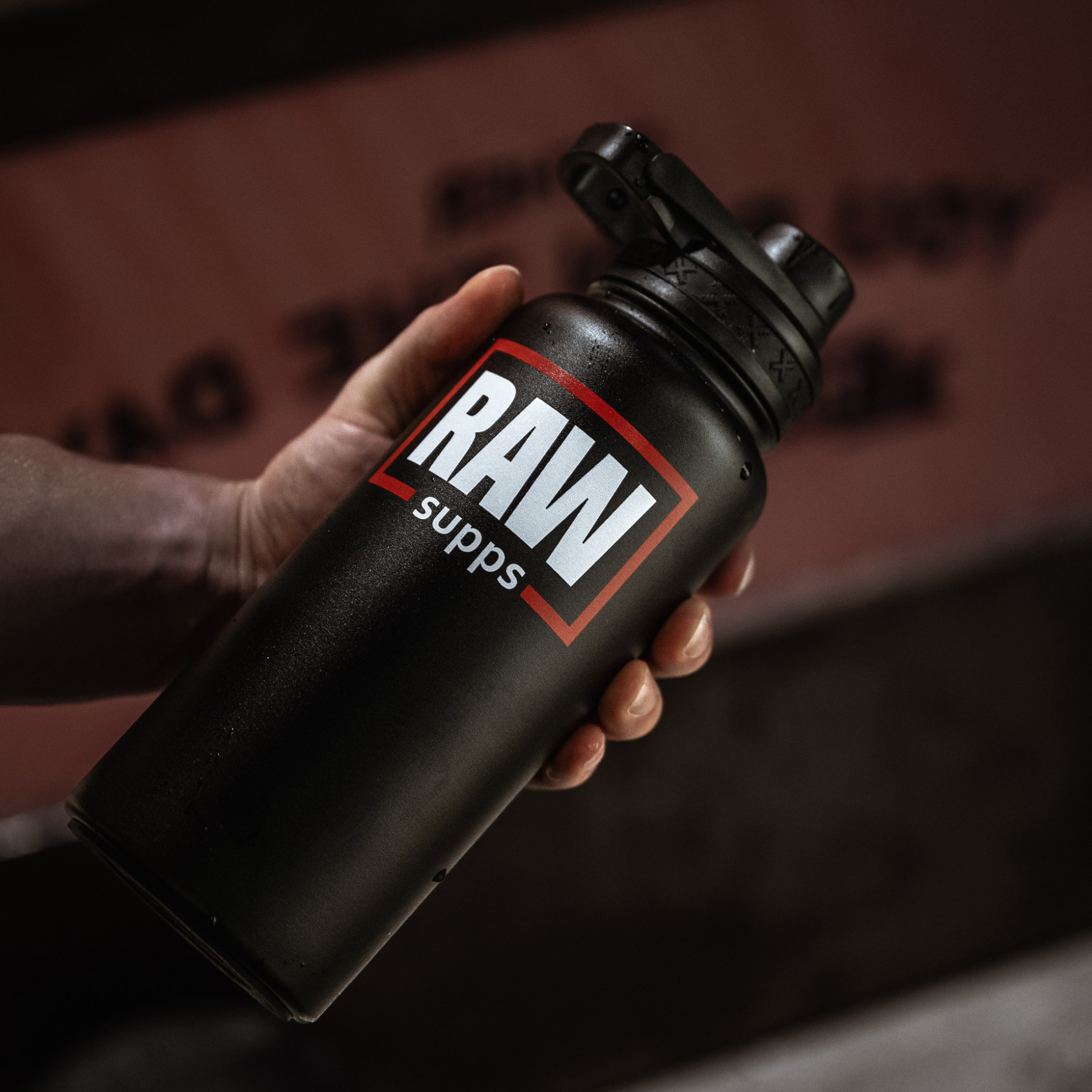 En man håller RAW SUPPS Insulated Sports Bottle i gymmiljö.Håll törsten i schack med RAW Supps Insulated Sports Bottle.