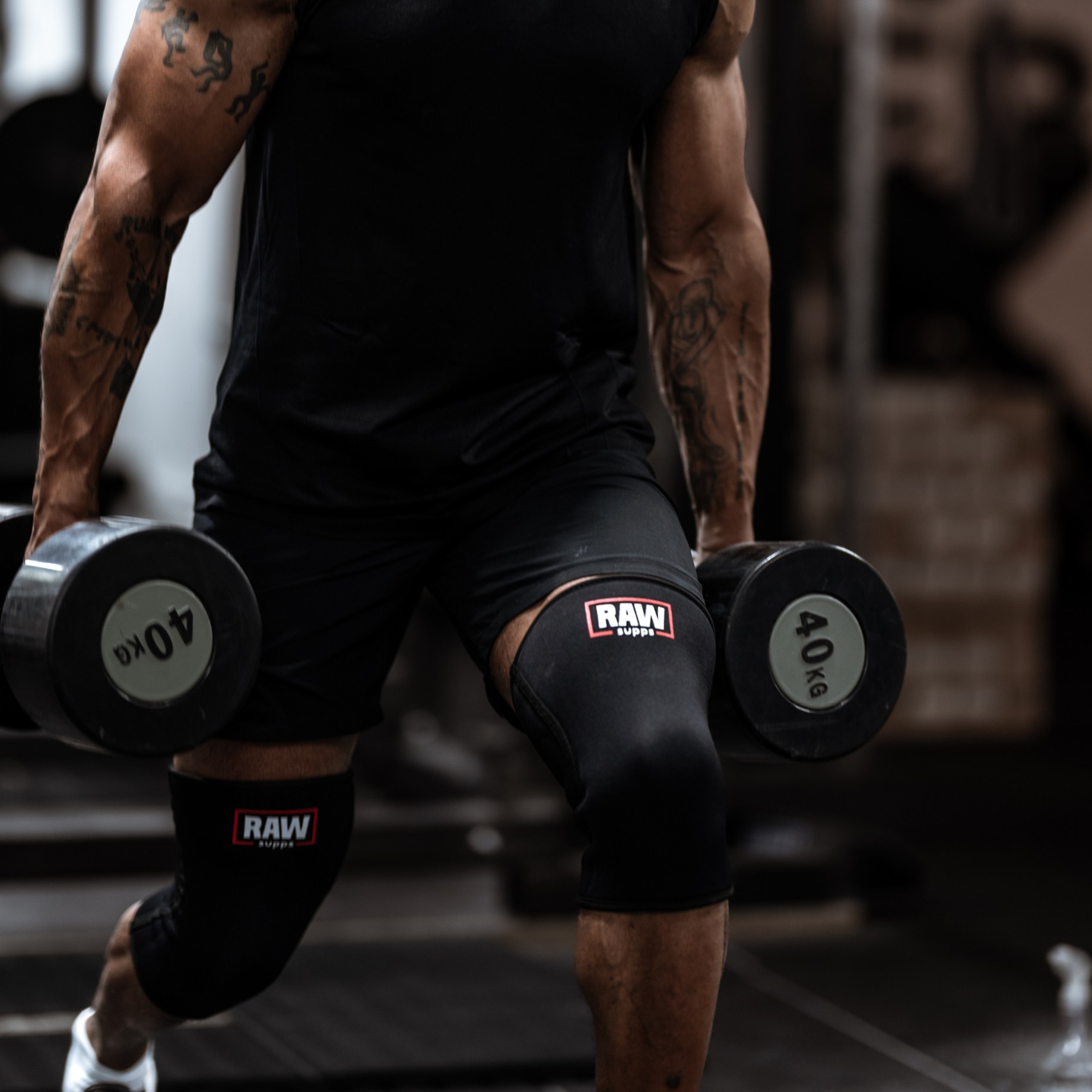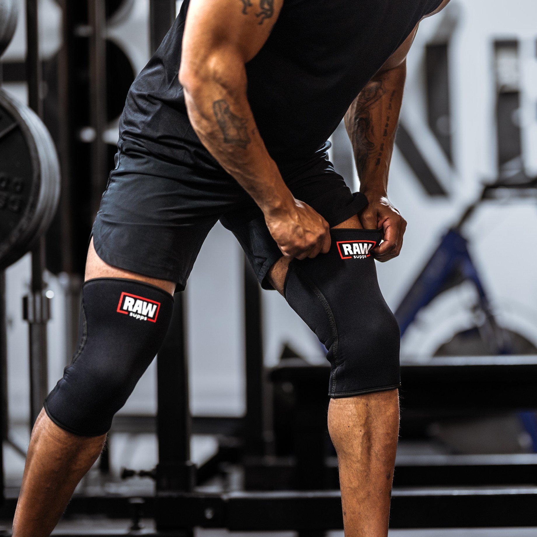 En man bär RAW SUPPS Knee Sleeves 7 mm på knäna i gymmiljö.Ge dina knän det bästa stödet under dina tyngsta lyft!
