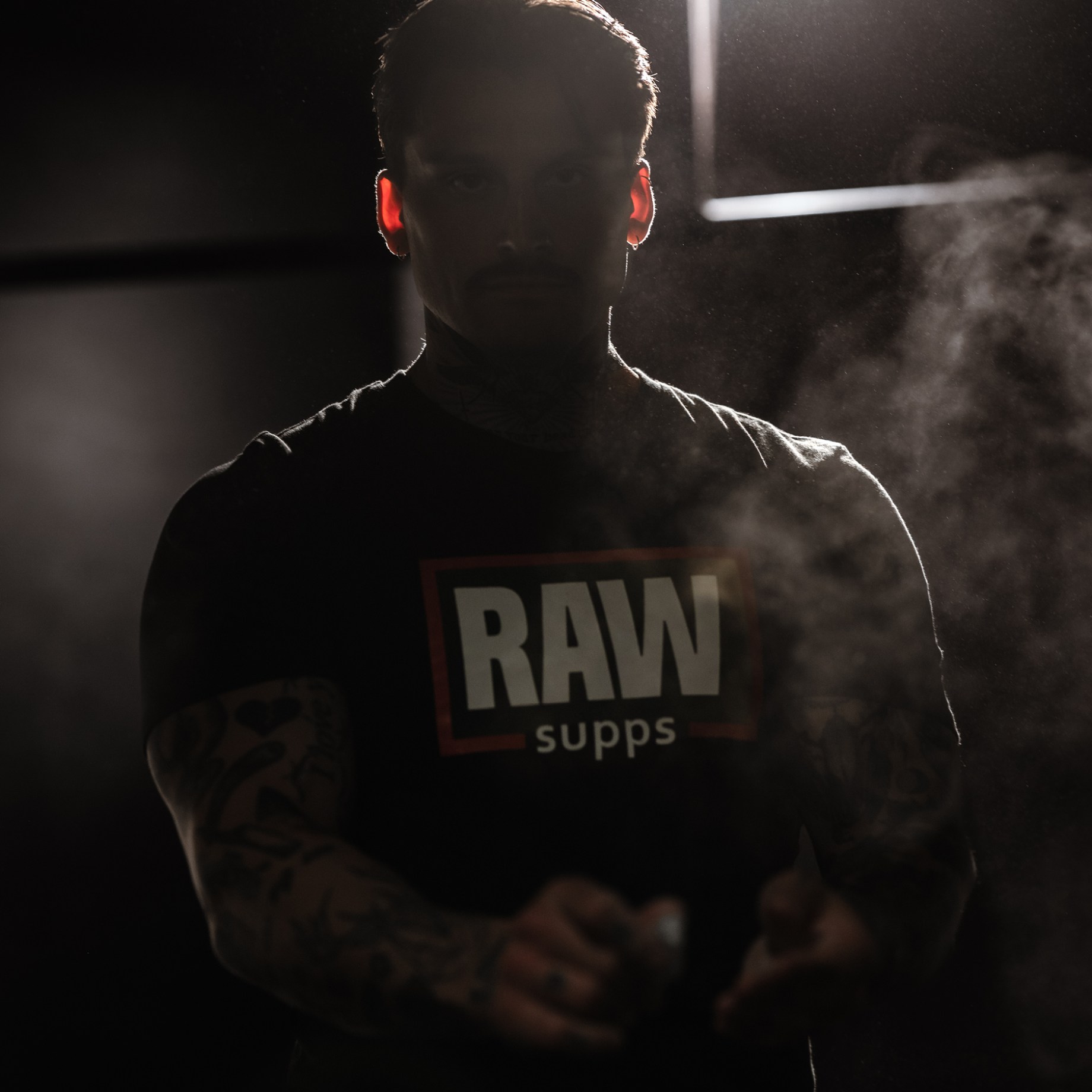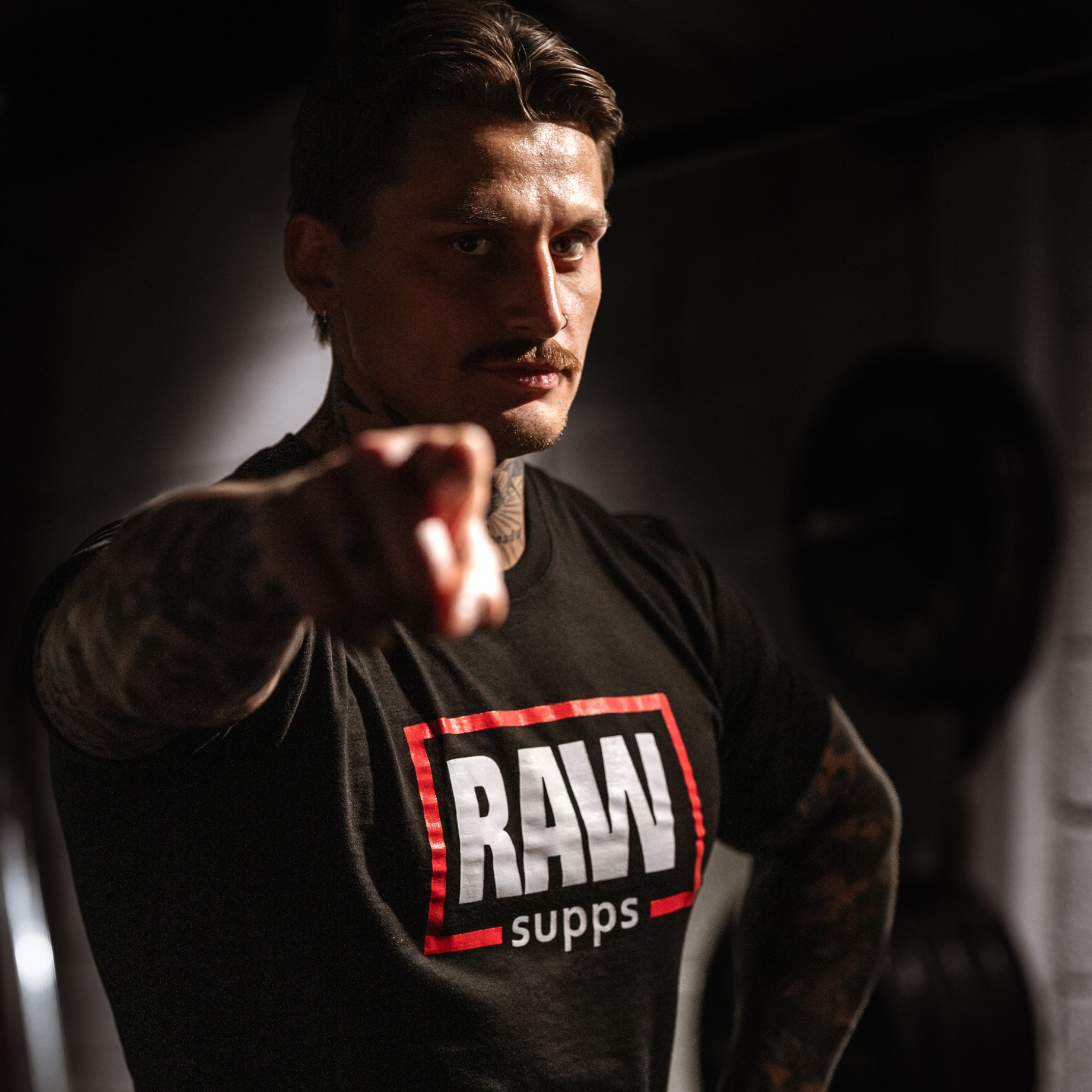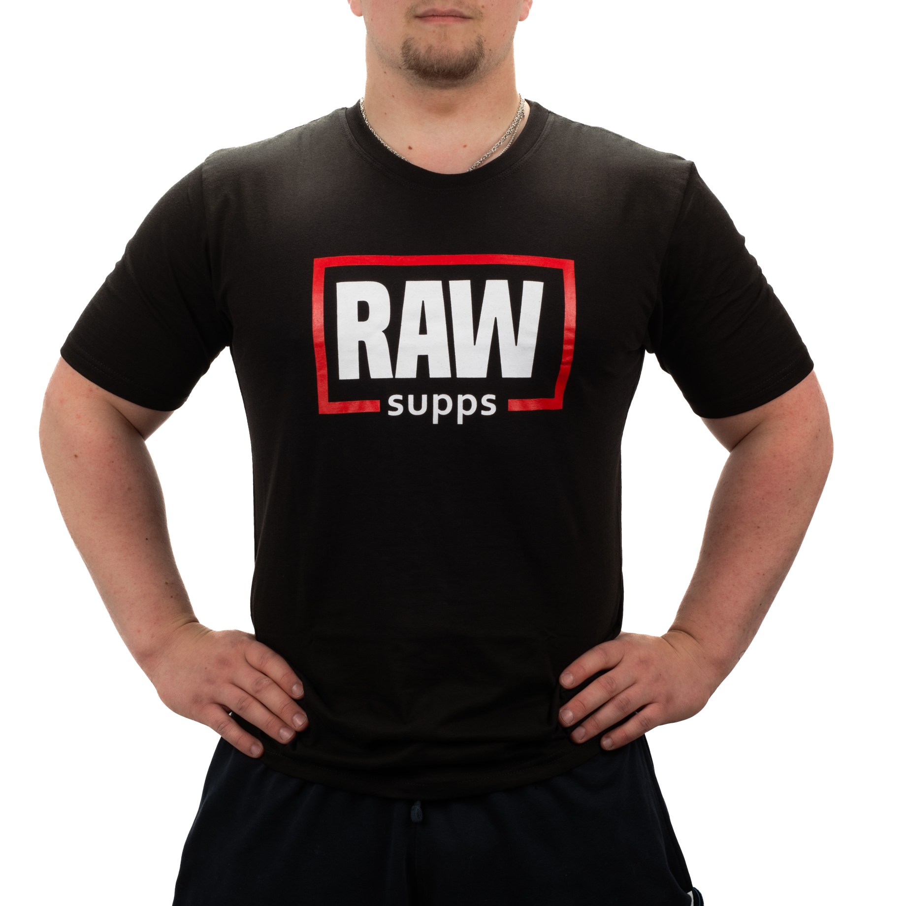 En person bär RAW SUPPS Logo Tee i gymmiljö.En t-shirt som passar hård träning och avslappnad vardag.