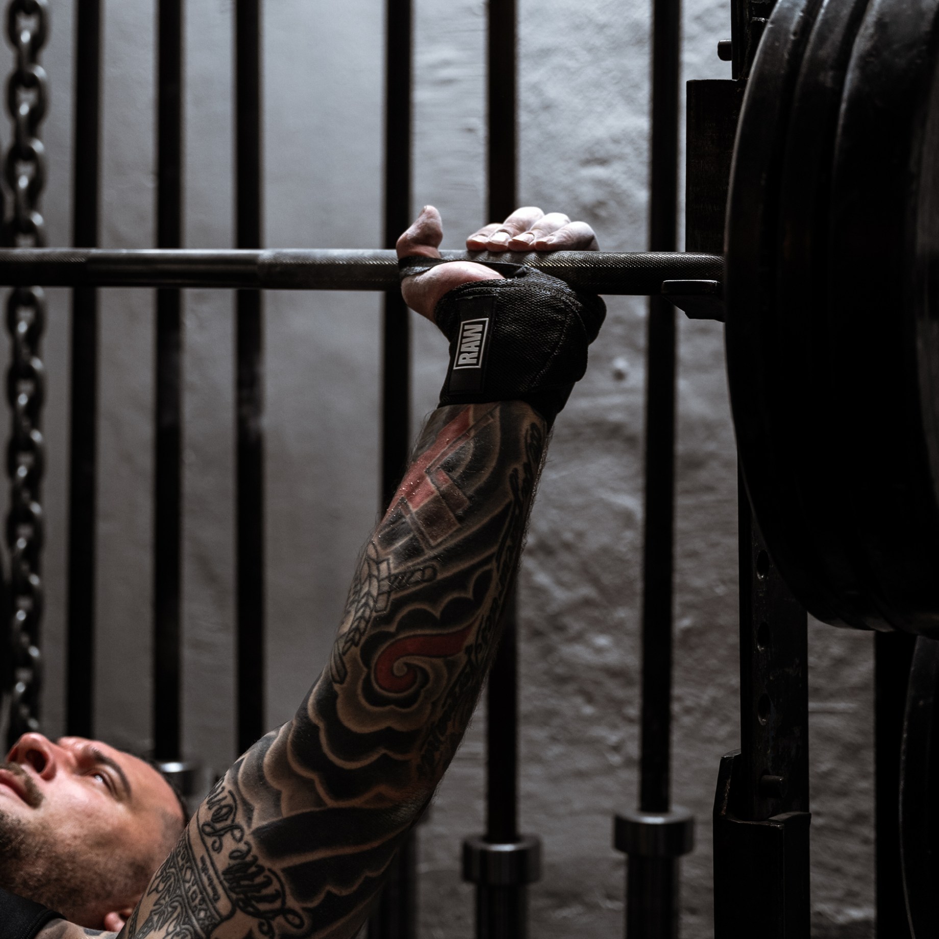 RAW SUPPS Wrist Wraps hänger på en stång i gymmiljö.Starkare lyft med RAW Wrist Wraps!